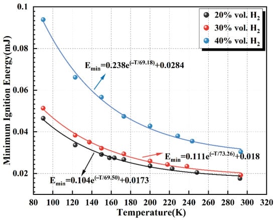 Figure 10 demonstrates the variation in MIE with temperature for hydrogen–air mixtures at hydrogen volume fractions of 20%, 30%, and 40%, respectively. Calculations indicate that the MIE increases significantly as the temperature decreases. Taking a hydrogen concentration of 30% as an example, when the initial temperature was reduced from 240 K to 93 K, the MIE increased approximately 1.3 times. The fitting analysis further shows an exponential growth relationship between MIE and temperature for cryogenic hydrogen–air mixtures.