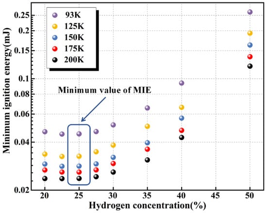 MIE of hydrogen–air mixtures for different hydrogen concentrations at initial temperatures of 93 K, 125 K, 150 K, 175 K, and 200 K.