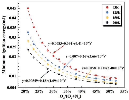 MIE of H2-O2-N2 mixture with fixed hydrogen concentration (25 vol.%) for various ratios of O2/(O2 + N2) at initial temperatures of 93 K, 125 K, 150 K, 175 K, and 200 K.
