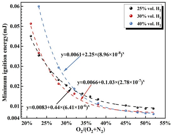 Calculations in this work show that the MIE of hydrogen–air mixtures is minimized at approximately 25% hydrogen concentration. Accordingly, a hydrogen volume fraction 25% is selected to investigate the influence of the oxygen concentration ratio [O2/(O2 + N2) = 21~52%] on MIE under different temperatures, as illustrated in Figure 12. The results indicate a pronounced nonlinear dependence of MIE on O2/(O2 + N2) at a fixed hydrogen concentration, exhibiting clear asymptotic behavior. For all initial temperatures examined, the MIE decreases sharply as the oxygen ratio increases from 21% to approximately 45%. Once the oxygen ratio exceeds 45%, the curve approaches a plateau, and further oxygen enrichment leads only to a marginal reduction in MIE.