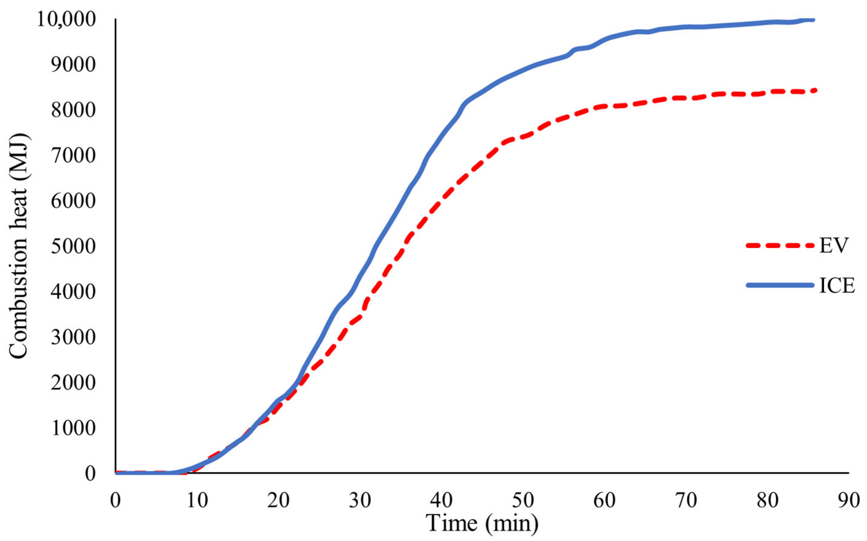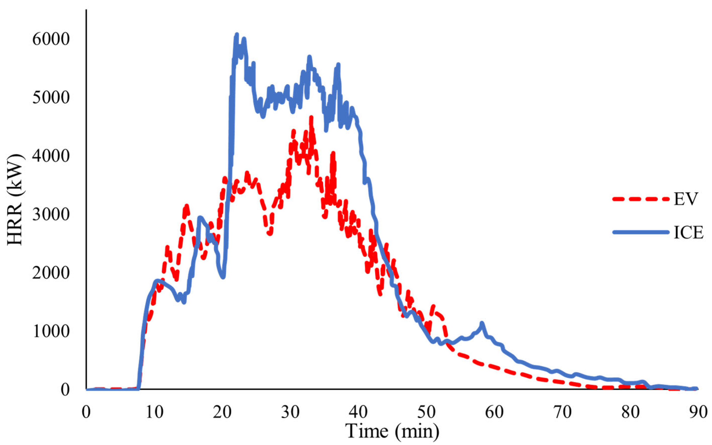 | BEV [4,5] | PHRR 4.2–6.3 MW often similar to or slightly lower than ICE; THRR of 6–9 GJ | HRR comparable to ICE; but long burning, possible re-ignition and high toxicity; jet flame during thermal runaway |