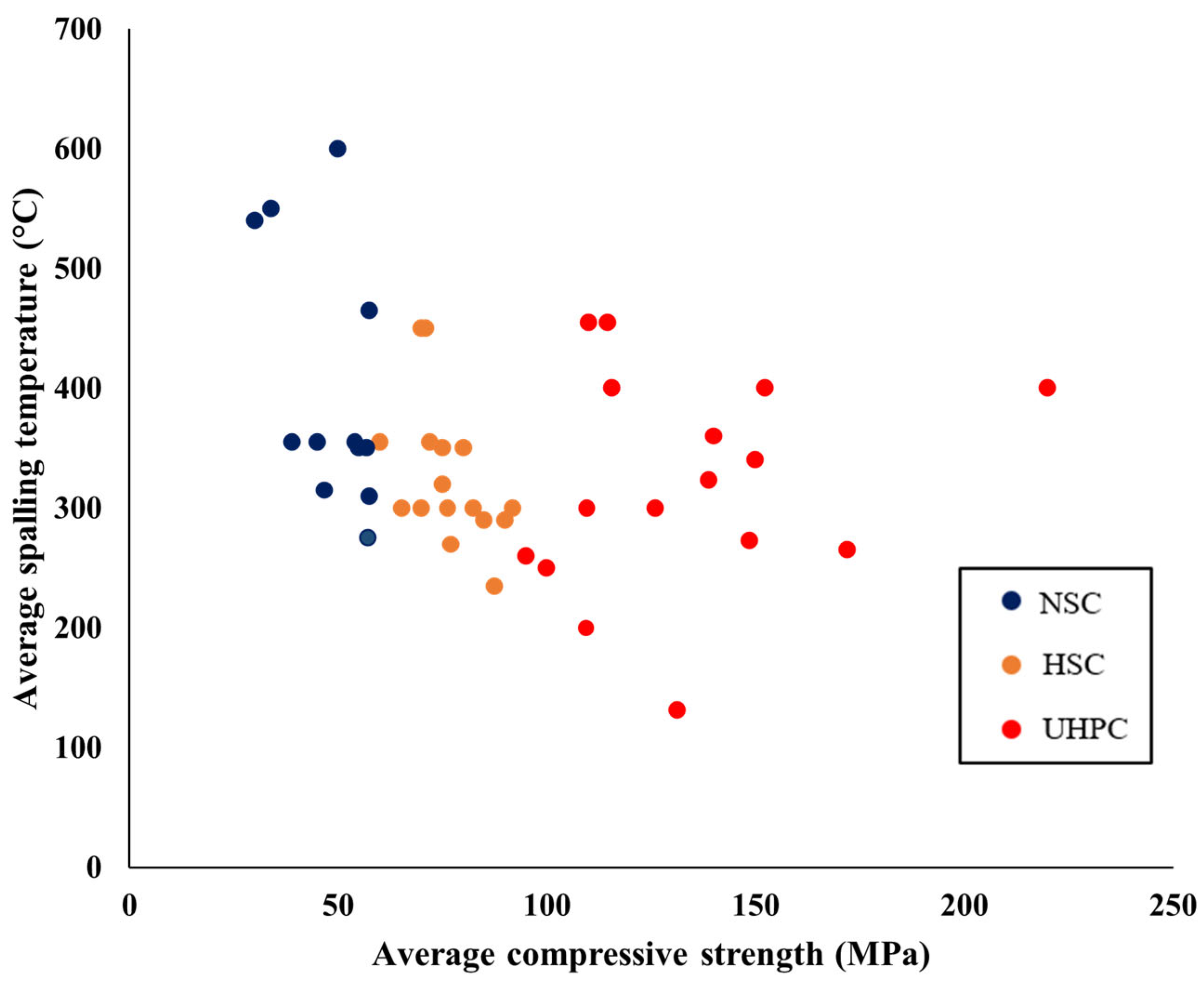 | Type of Concrete | Concrete Compressive Strength (MPa) | Spalling Temperature (°C) | Reference |