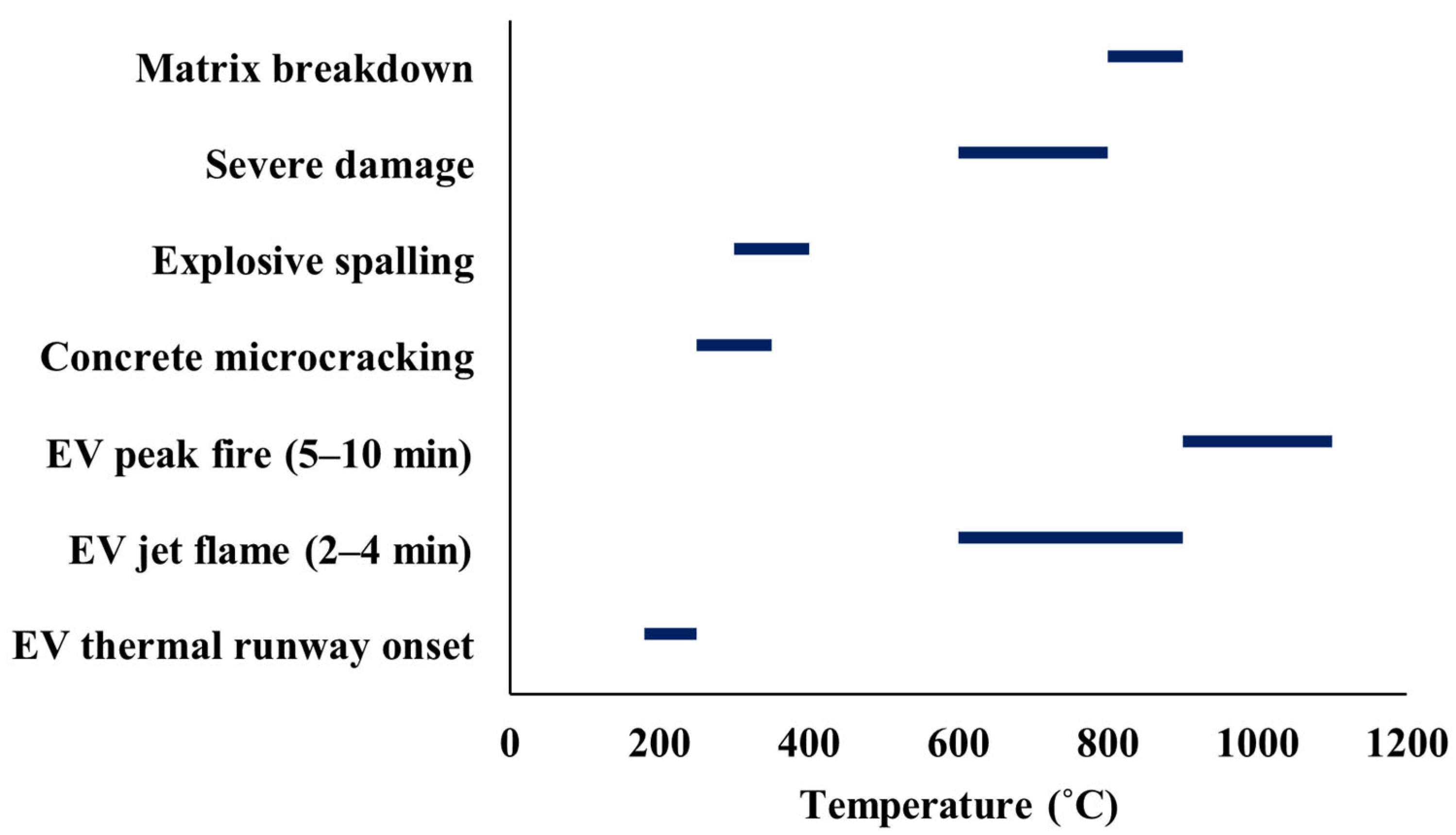 | EV Battery Fire (Li-ion, 60–90 kWh) [3,4,27] | 1000–1300 °C (localised peaks up to 1400 °C [91]) | 10–20 min | 2–4 h (with potential re-ignition) | Exothermic lithium-ion cell reaction, metal combustion, and off-gas ignition | Produces localised high-intensity heating and long-duration exposure Increases risk of spalling, reinforcement exposure, and loss of load-bearing capacity. |