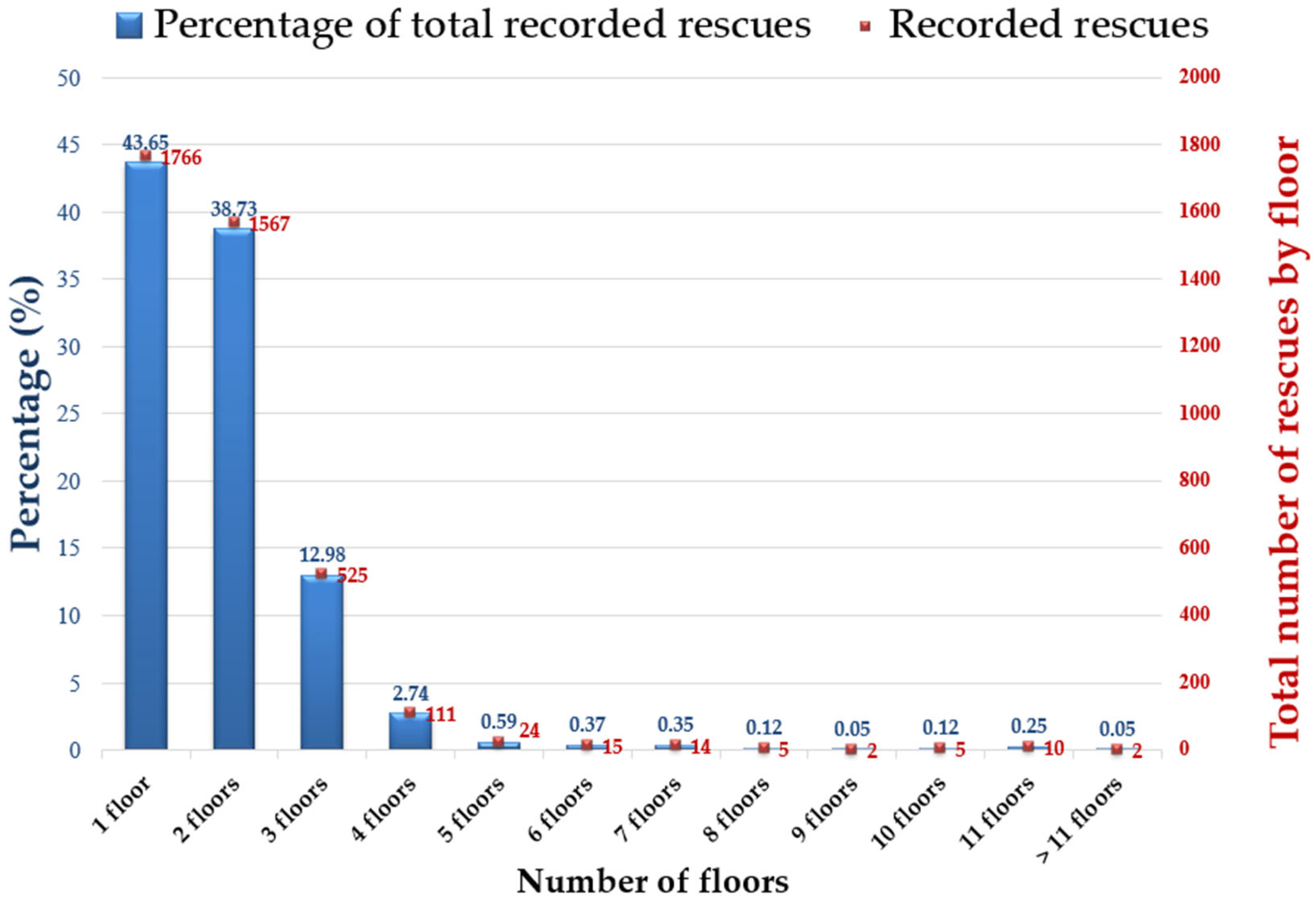 The overall decrease in rescues with height reflects increasing access and evacuation times. The local deviation observed at the 11th floor is likely influenced by the limited number of cases, combined with specific building features such as access to roof terraces or protected roof areas, which may temporarily improve survival and rescue conditions; therefore, this variation should be interpreted as statistical scatter rather than a distinct trend.