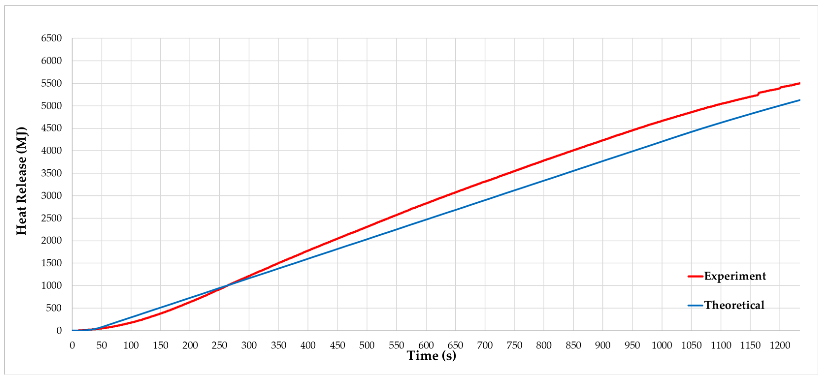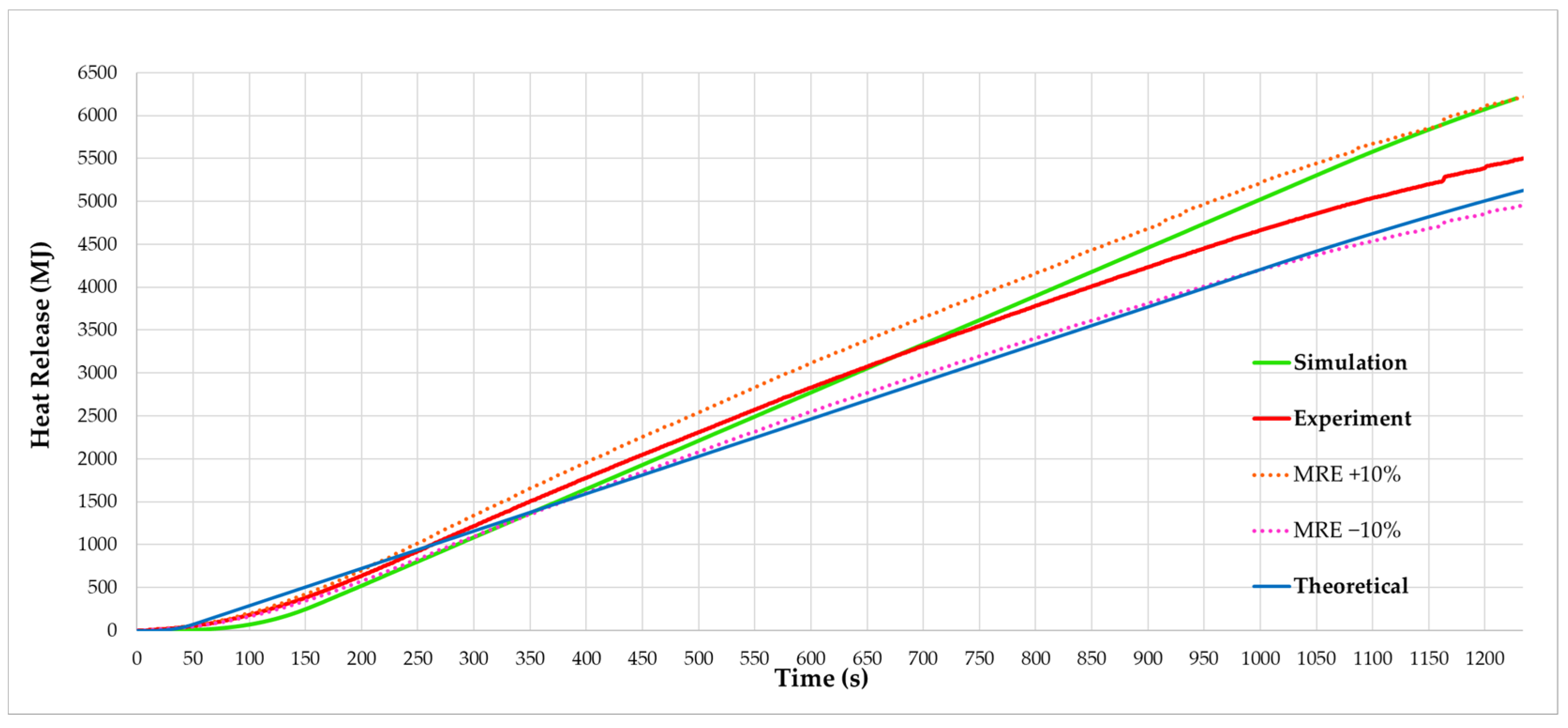 The mass loss measured throughout the experiment enabled the real-time determination of the HRR, given the linear relationship between these two quantities through the calorific value of the fuel. Once the experiment was completed, the theoretical HRR curve generated by the reference model [