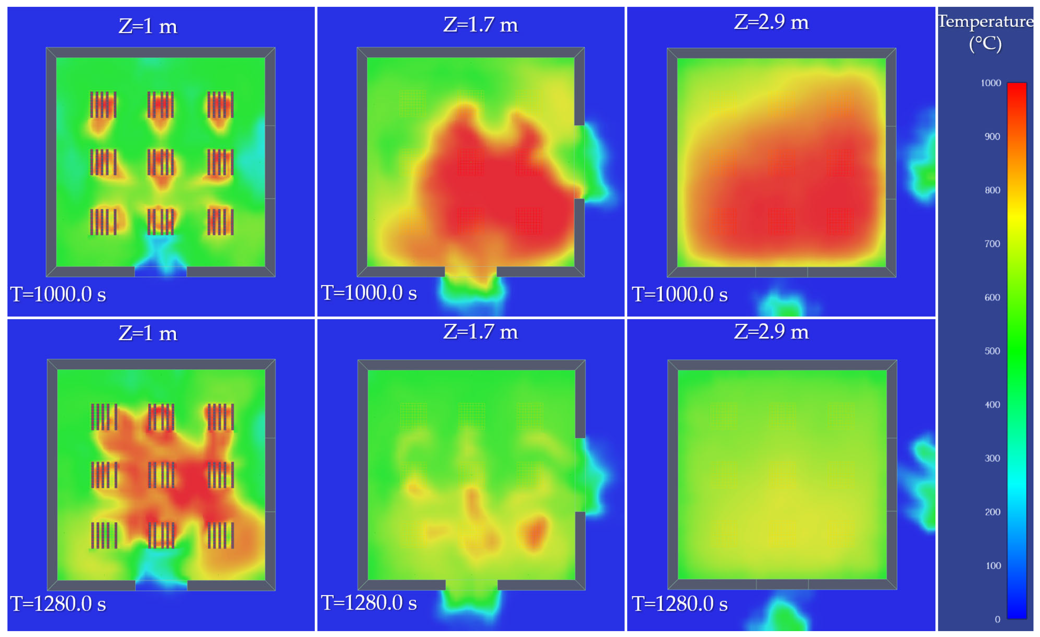 Figure 6 presents the horizontal temperature fields at three characteristic height levels (Z = 1.0 m, 1.7 m, and 2.9 m) within the compartment at two representative time instants, T = 1000 s and T = 1280 s. At T = 1000 s, corresponding to the fully developed fire stage, a pronounced thermal stratification is evident. The upper layer (Z = 2.9 m) is uniformly dominated by high temperatures exceeding 700–800 °C, indicating the accumulation of hot combustion gases. At the intermediate level (Z = 1.7 m), elevated but spatially non-uniform temperatures reflect partial mixing and stratified gas layering. Near the floor (Z = 1.0 m), localized high-temperature regions associated with the wood cribs are clearly defined, accompanied by cooler inflow air entering through the lower exterior opening.