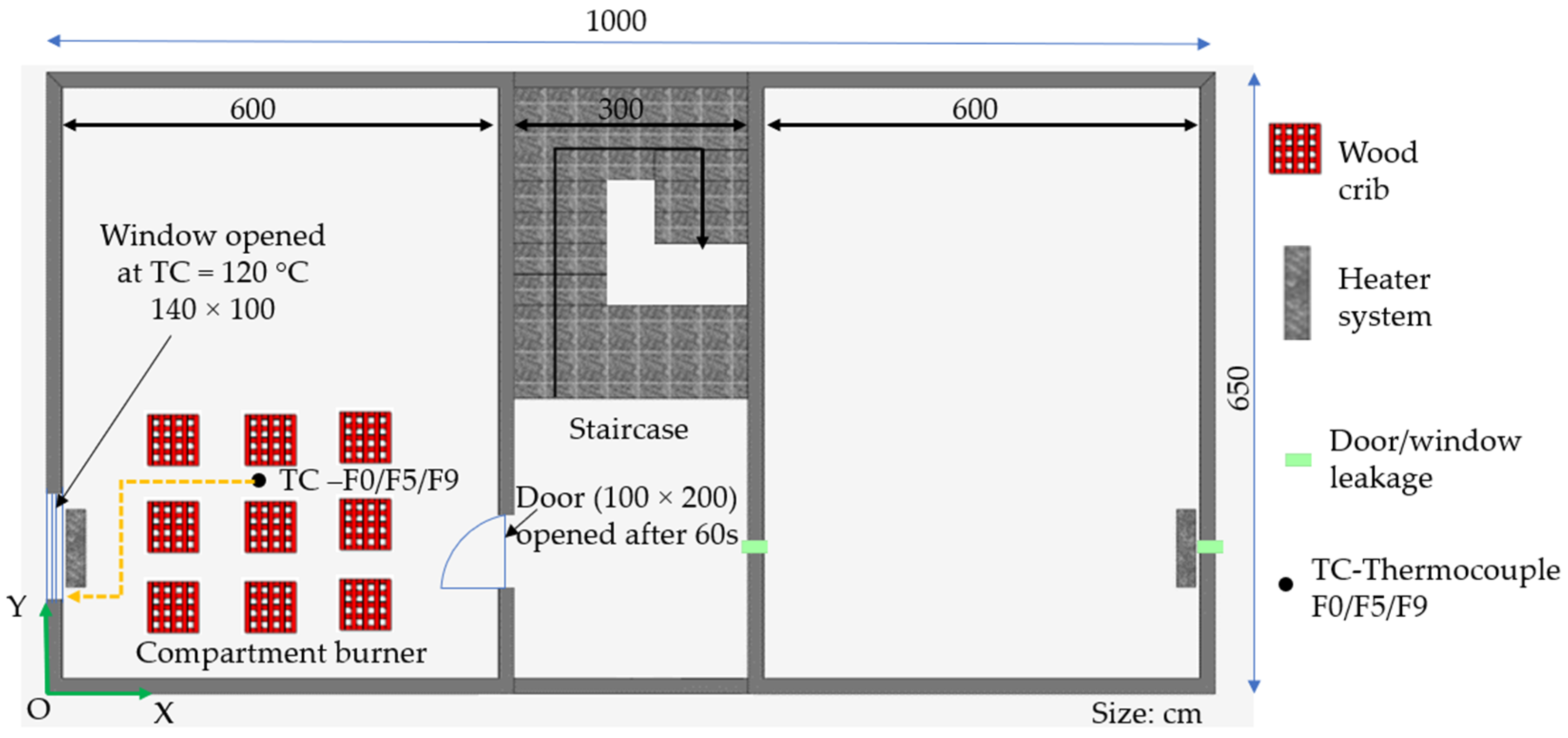 The window of the fire compartment (1.40 × 1 m) opens dynamically when the local temperature reaches 120 °C, simulating a thermally driven opening.