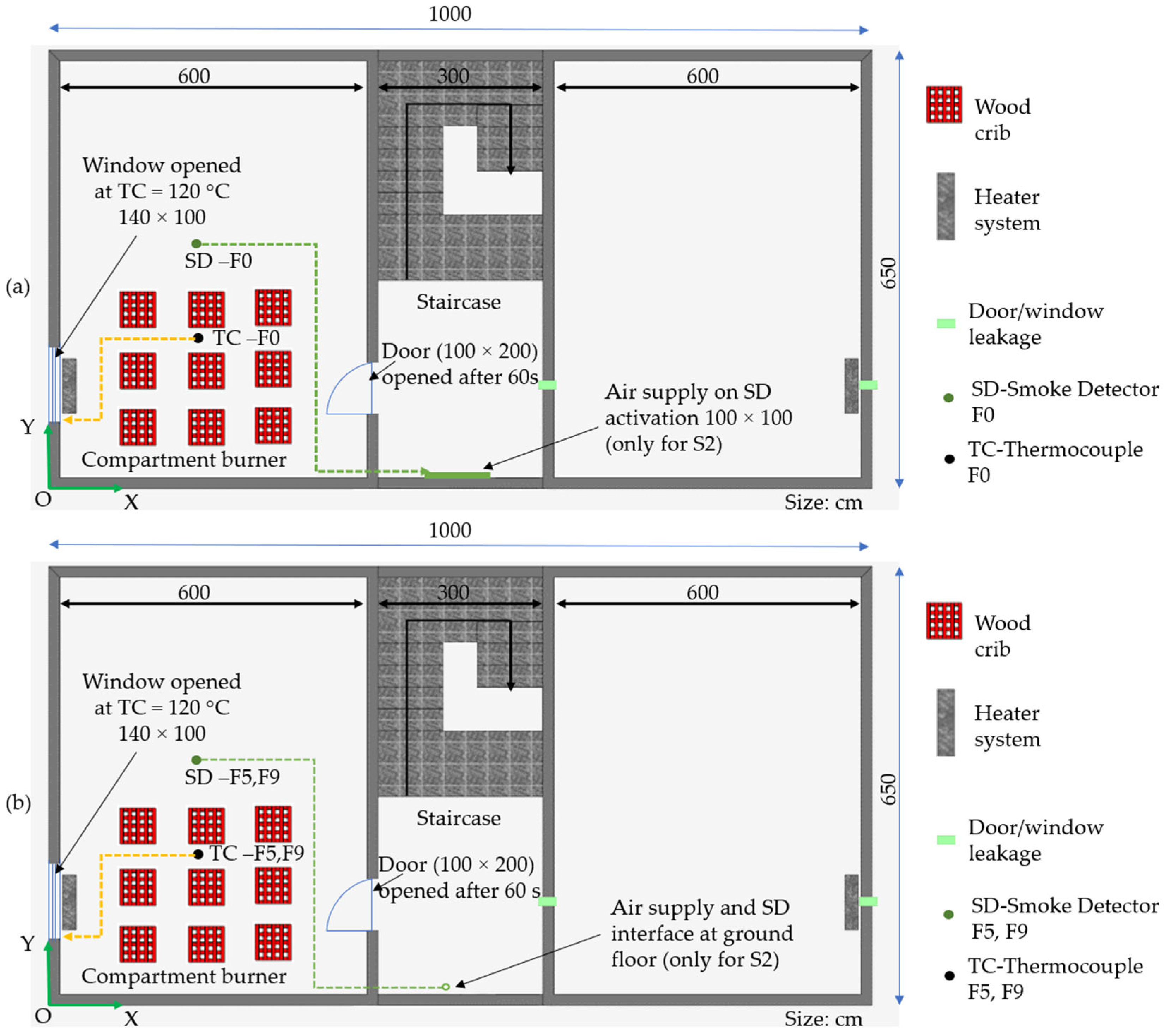 The door of the fire compartment (1 × 2 m) opens 60 s after ignition in all cases.