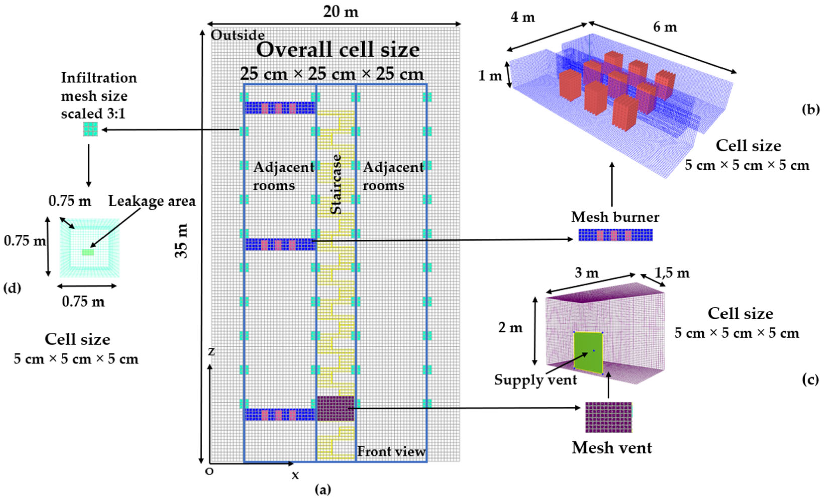 Accordingly, the refinement analysis incorporated both single-mesh and multiple-mesh discretization strategies, while the cell size was limited to two representative resolutions of 5 cm and 10 cm. This restriction, reduced from the broader mesh intervals commonly explored in the literature, was intentionally adopted to maintain sufficient sensitivity to grid-induced variations while ensuring computational tractability. In parallel, the crib surface area was varied between 40 m
