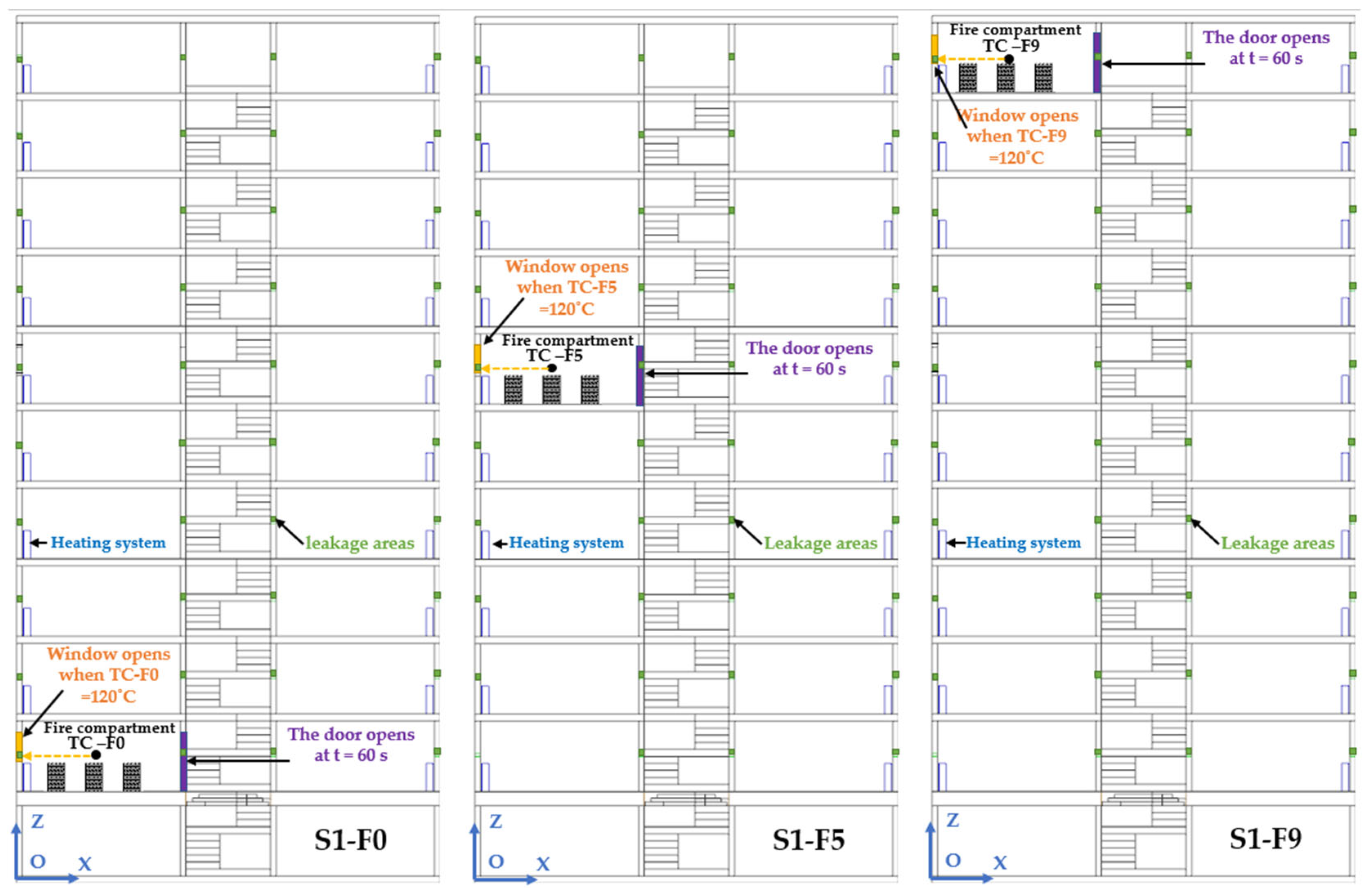 Three numerical simulations were performed: S1-F0 (fire on the ground floor), S1-F5 (fire on the 5th floor), and S1-F9 (fire on the 9th floor).