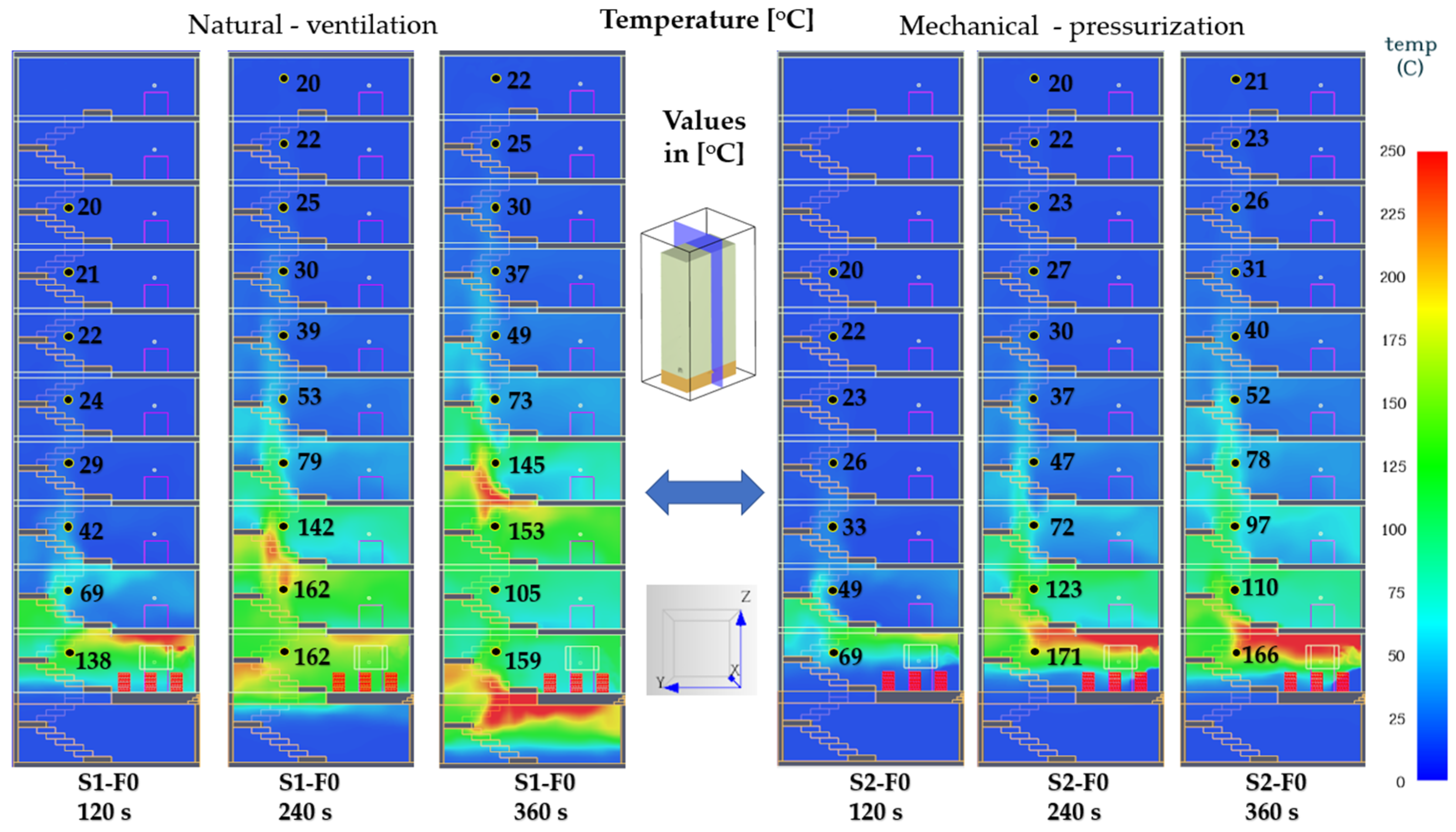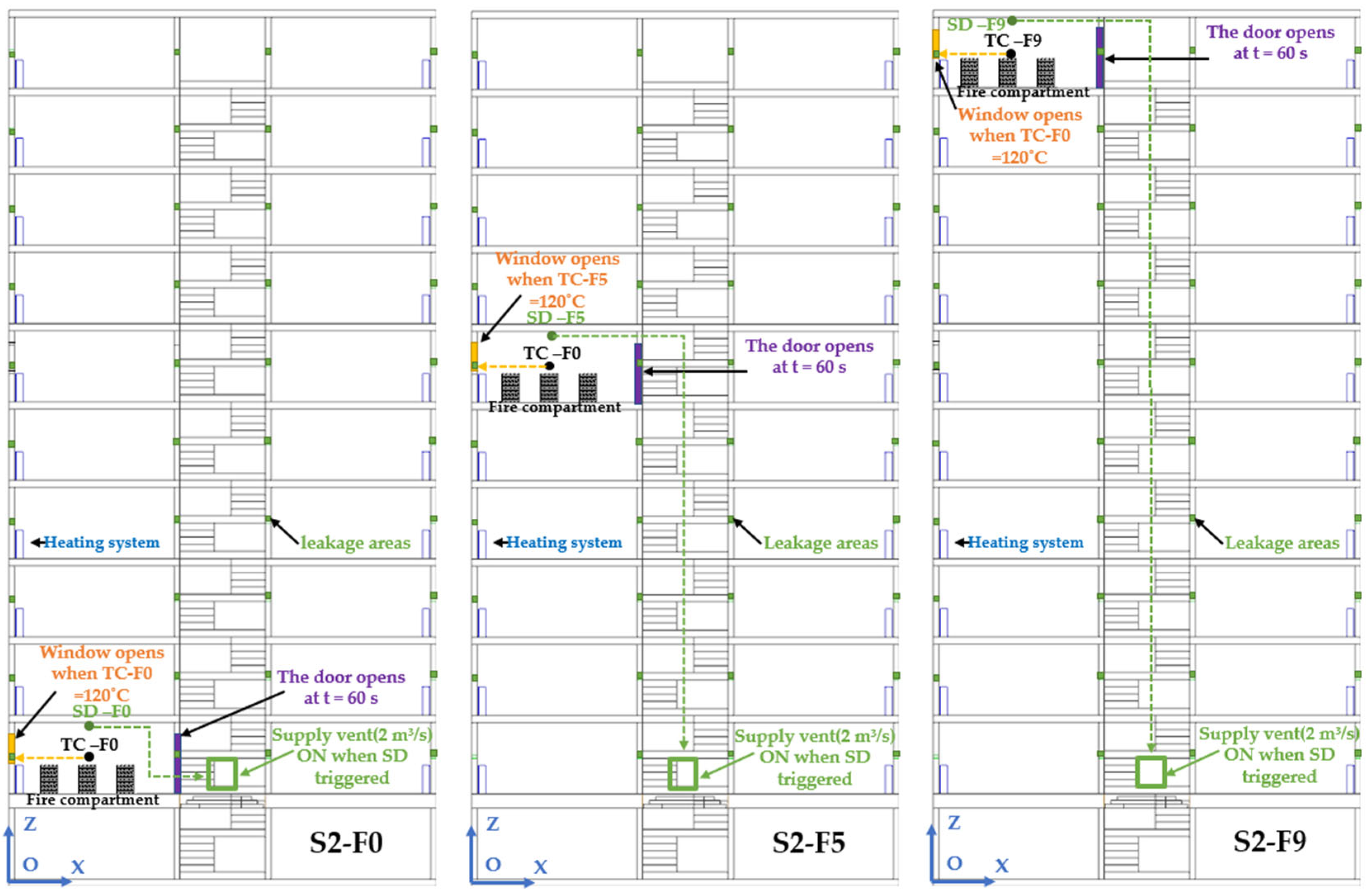 Three numerical simulations were performed: S2-F0 (fire on the ground floor), S2-F5 (fire on the 5th floor), and S2-F9 (fire on the 9th floor).