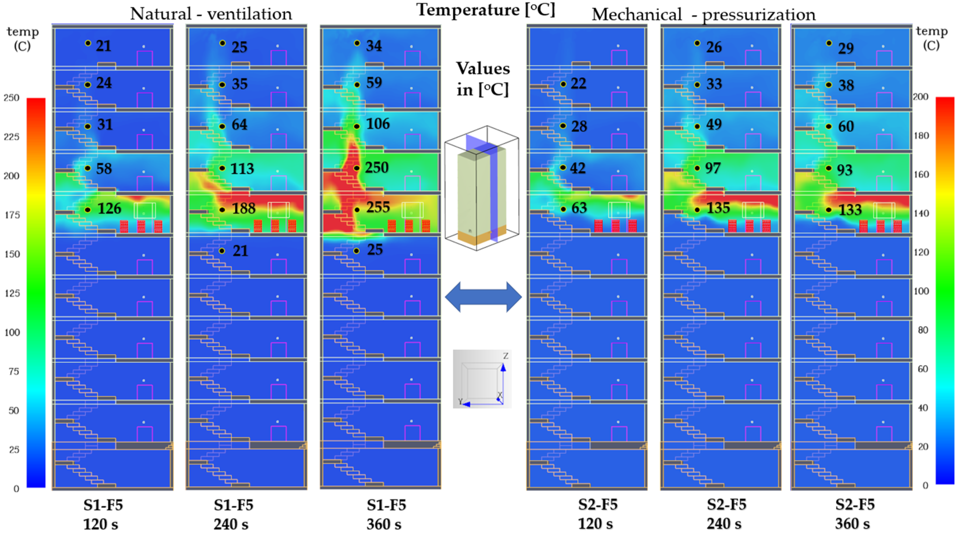 Consequently, for protecting evacuation routes, including the stairwell, it is essential that air temperature be maintained below 60 °C throughout the entire evacuation period, since exceeding this limit rapidly reduces safe exposure time and compromises interior safety conditions. To evaluate the thermal behavior in evacuation-critical zones, the simulations included a vertical slice positioned along the stairwell, which communicates with the fire compartment through a door automatically opened at t = 60 s, as well as temperature measurement points located on each floor. This configuration enables precise observation of how hot smoke enters and spreads within the stairwell under the combined influence of the stack effect and potential recirculation patterns.