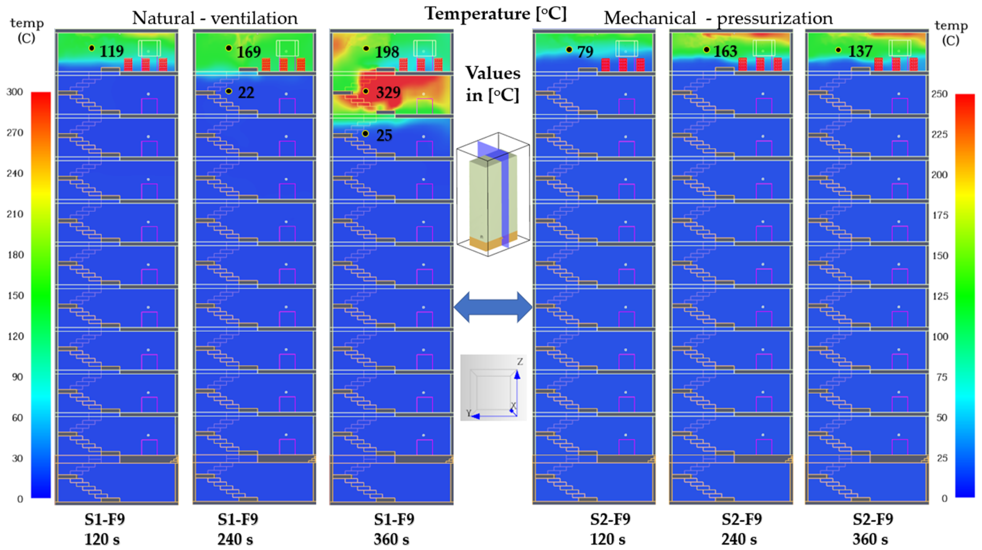 Figure 15), corresponding to a fire located on the top floor, highlights pronounced differences in stairwell convection and heat retention. Under natural ventilation (S1-F9), the stack effect drives strong upward buoyant flow, leading to a stagnant hot-gas layer near the ceiling where temperatures reach 329 °C. The mean stairwell temperature, calculated as 63.2 °C, confirms intense thermal accumulation in the upper section, with levels 8 and 9 becoming completely non-tenable. In contrast, mechanical pressurization (S2-F9) introduces a forced airflow that partially counteracts buoyancy. The average temperature decreases to 33.7 °C, while the peak temperature is reduced to 137 °C, indicating a 47% reduction in mean thermal load compared to S1.