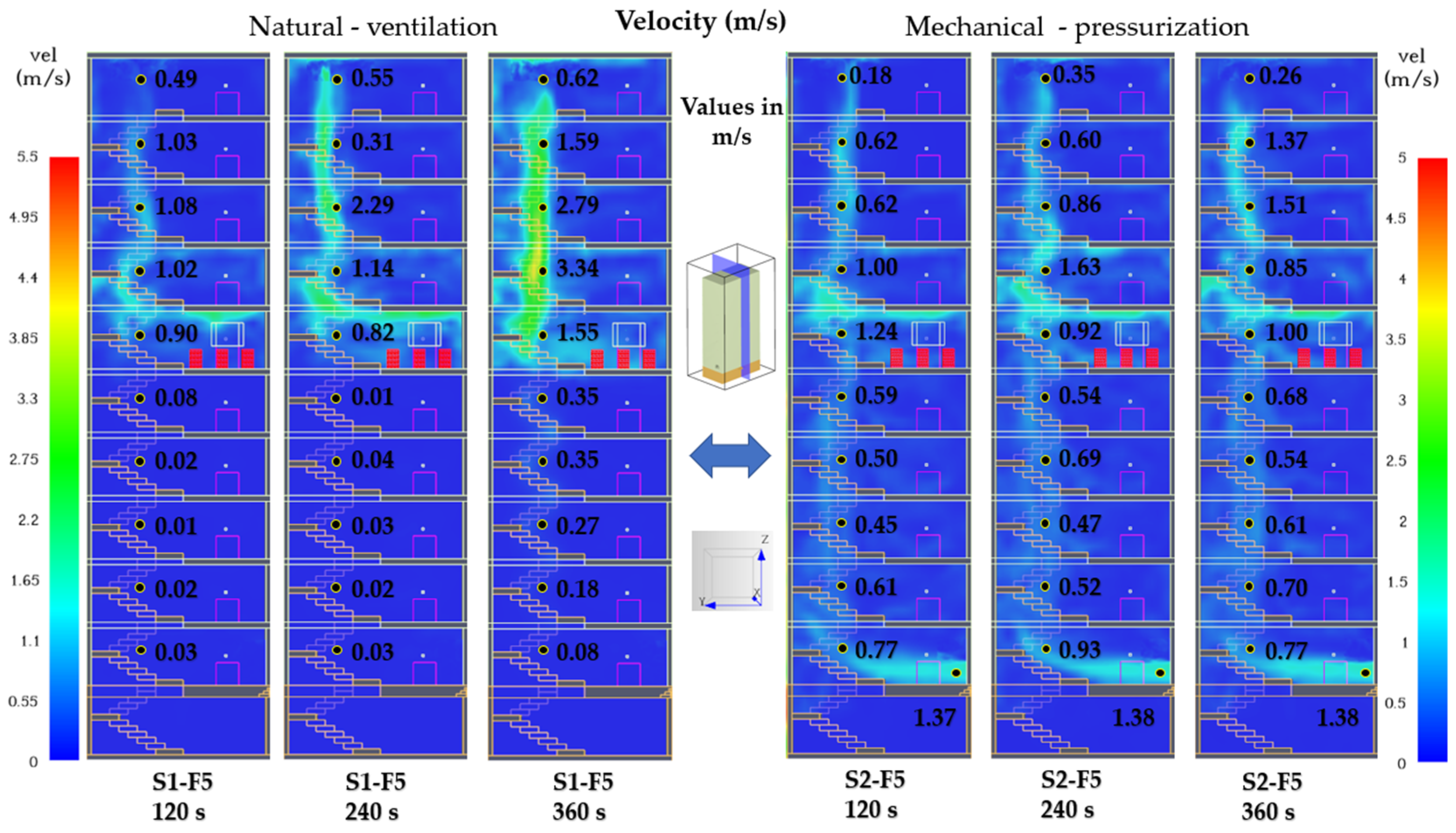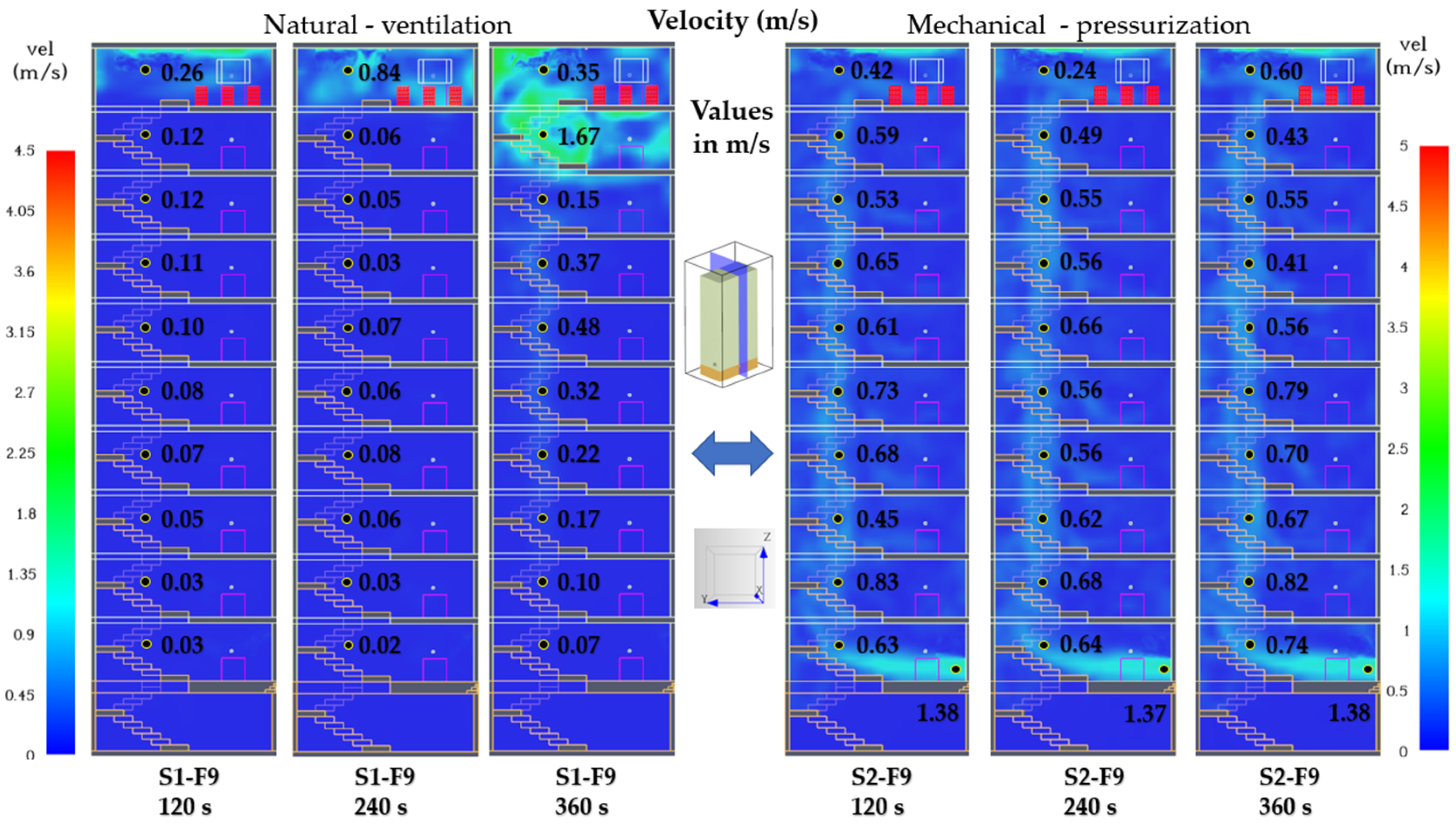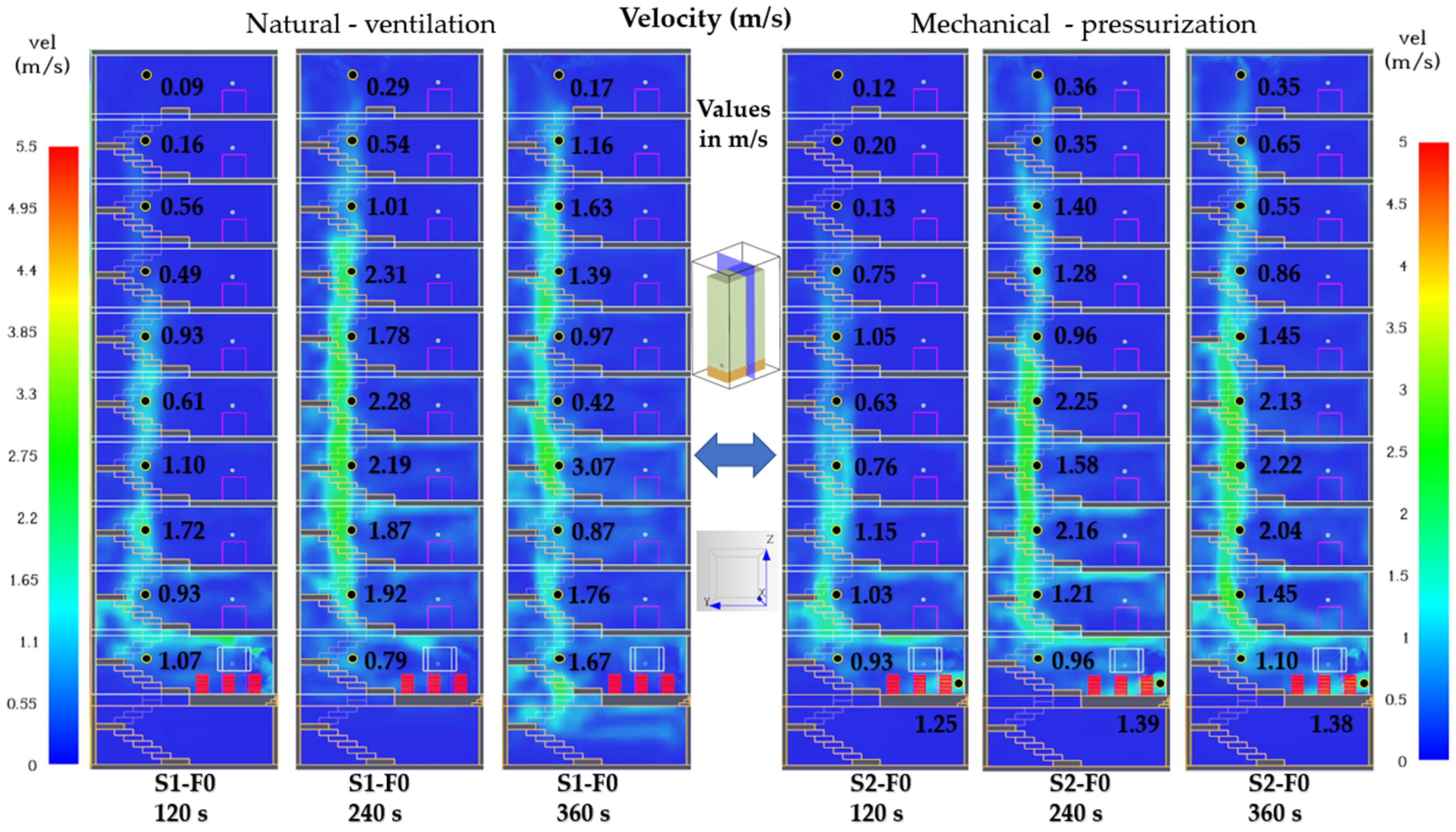 Figure 18), Scenario S1 shows that airflow within the stairwell is extremely weak. Velocities remain near zero along most of the vertical shaft, and the thermal plume generated in S1-F9 is insufficient to establish a sustained stack effect. The flow remains isolated and unstable, characterized by recirculation pockets and stagnant regions persisting even at 360 s. In Scenario S2, the ground-floor pressurization fan generates a stable upward airflow through the lower and intermediate levels (F0–F8), establishing a continuous pressure column up to the top floor. At the ninth floor, velocities remain below 1 m/s, allowing limited smoke infiltration into the stairwell; however, the mechanically induced upward flow prevents significant smoke accumulation at the upper landing and protects the lower floors from backflow and thermal contamination.