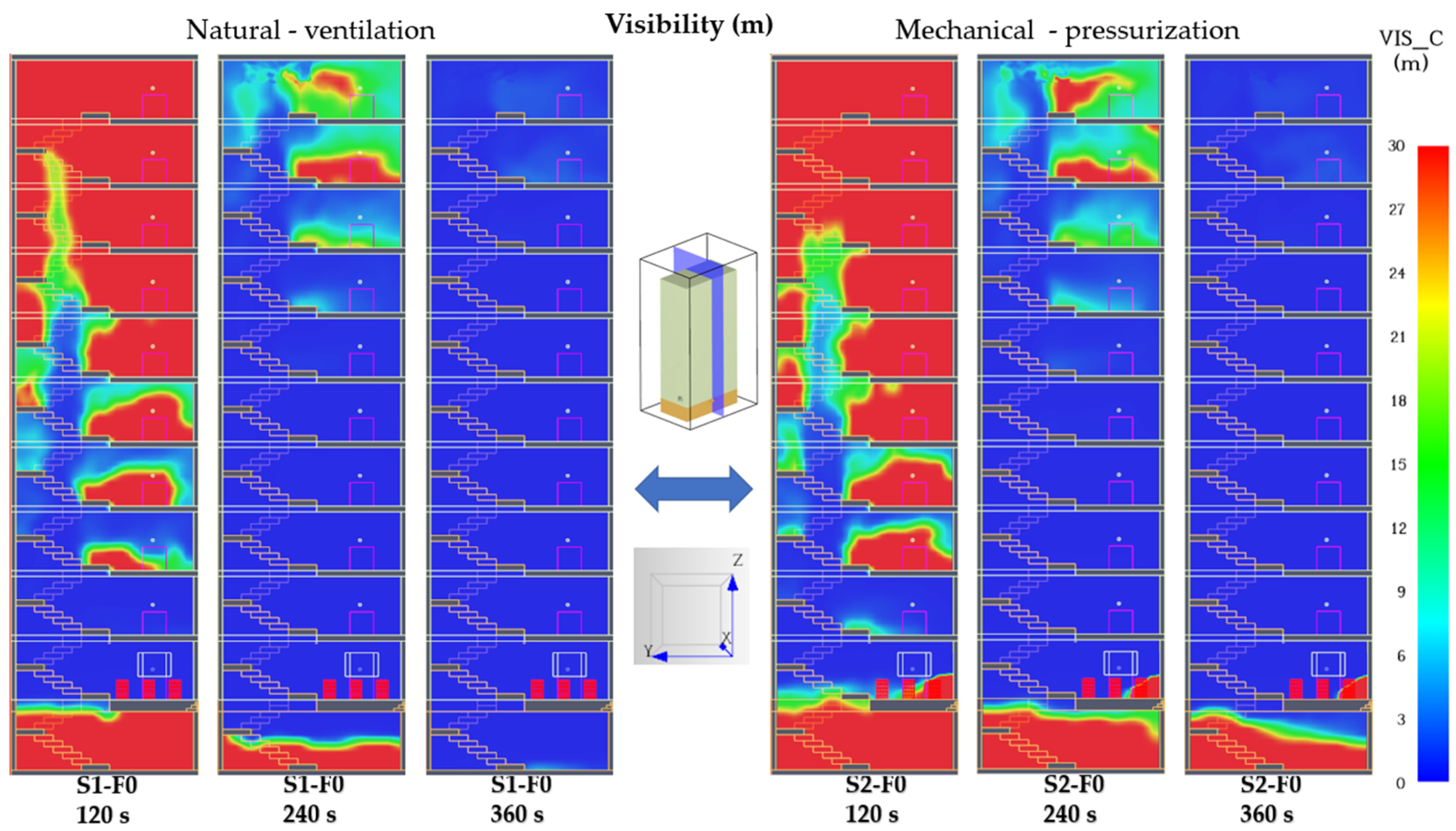 Figure 19), visibility deteriorates rapidly in both configurations. Under natural ventilation (S1-F0), the stairwell becomes completely smoke-filled within 360 s, with visibility below 2–3 m across all levels. In the mechanically pressurized case (S2-F0), visibility remains high only in the basement zone, where pressurization air is supplied, maintaining 28–30 m. Above the ground floor, however, visibility collapses to values similar to S1, generally below 5 m. The overall improvement is therefore localized and limited, confirming that mechanical pressurization protects only the supply zone but cannot prevent smoke accumulation in the vertical shaft. These findings highlight the need for enhanced airflow direction or compartment sealing at the ground-floor interface to ensure full stairwell protection.