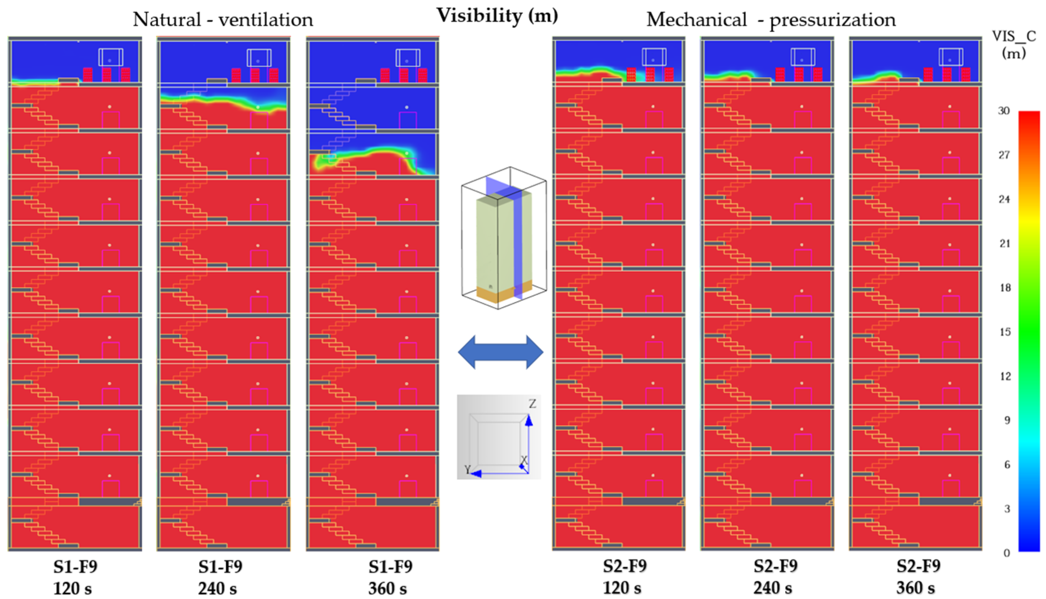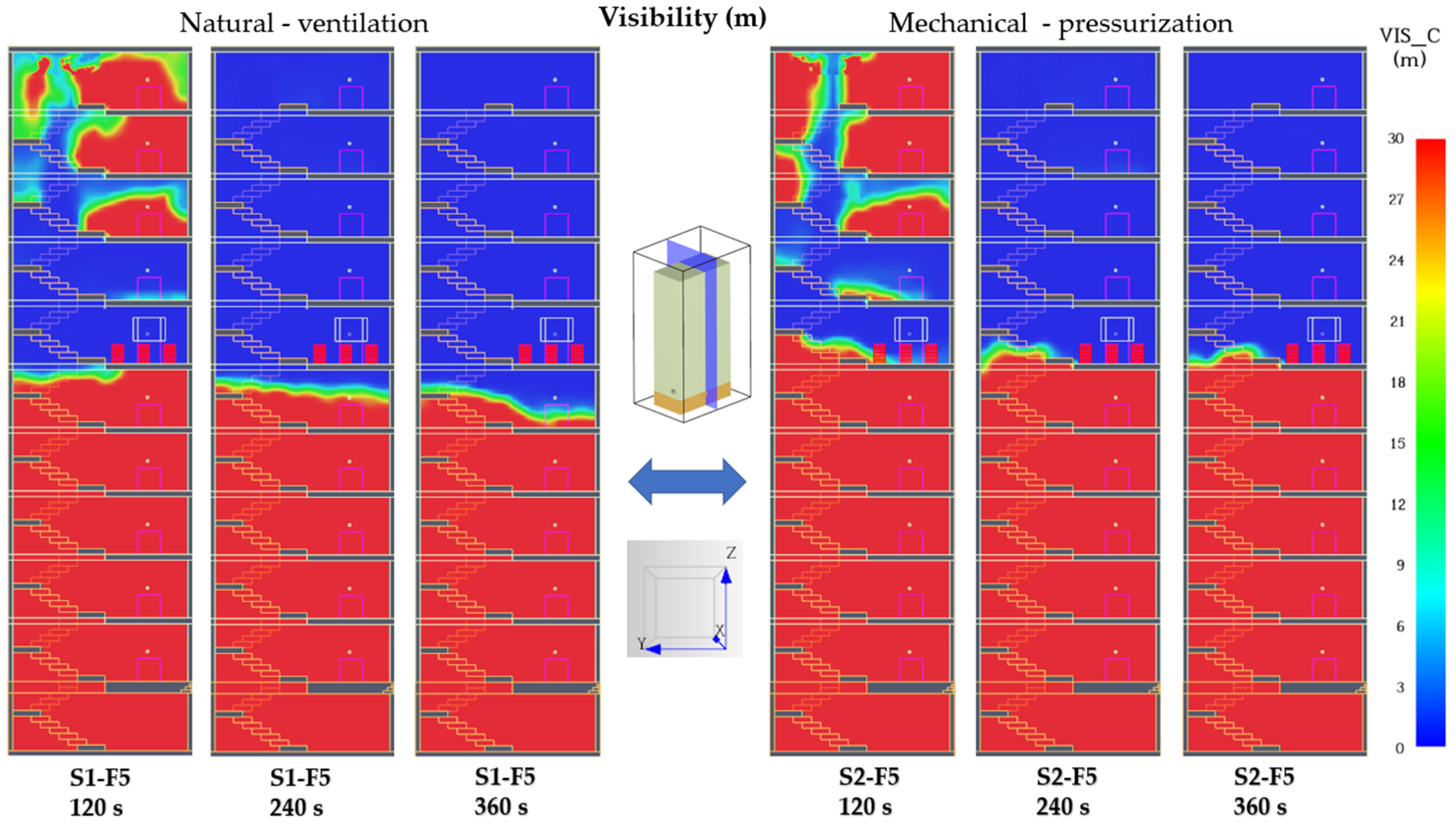 Figure 20), visibility in the stairwell is critically reduced in both scenarios. Under natural ventilation (S1-F5), the mid and upper sections are completely obscured, with visibility below 3 m across five consecutive levels. In the mechanically pressurized case (S2-F5), only the basement and first four floors maintain 28–30 m visibility, while the central and upper zones exhibit heavy smoke accumulation similar to S1. The mean visibility improvement is confined to the lower third of the stairwell, confirming that single-point pressurization protects the supply zone but cannot sustain clear conditions near or above the fire floor.