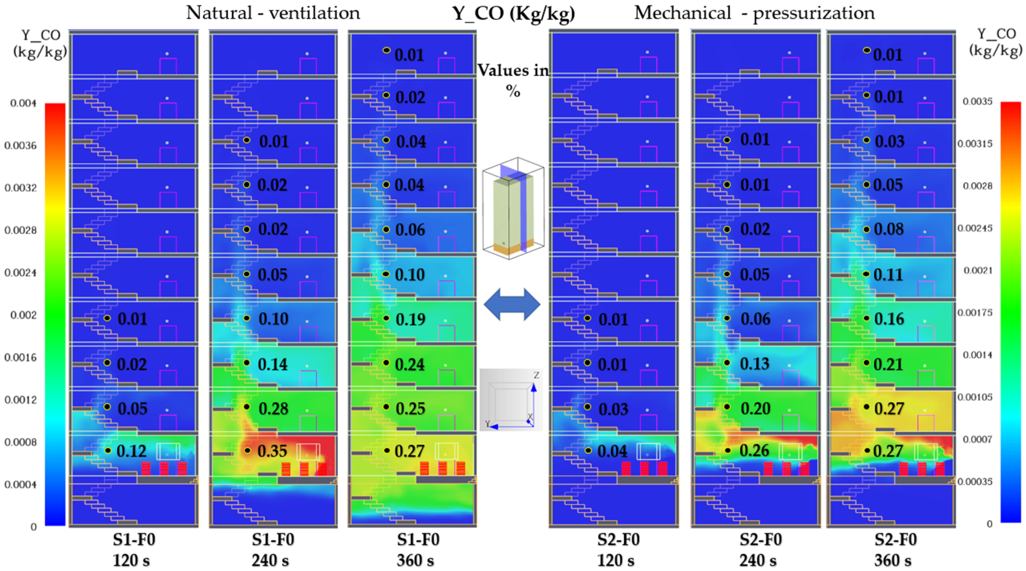 −3 kg/kg), and high values (0.20–0.27%) remain confined to the fire and upper floors. Although pressurization limits downward gas migration, both scenarios remain above the tenability threshold, confirming that airflow supplied only from the ground floor cannot control CO accumulation when the fire occurs at mid-height.