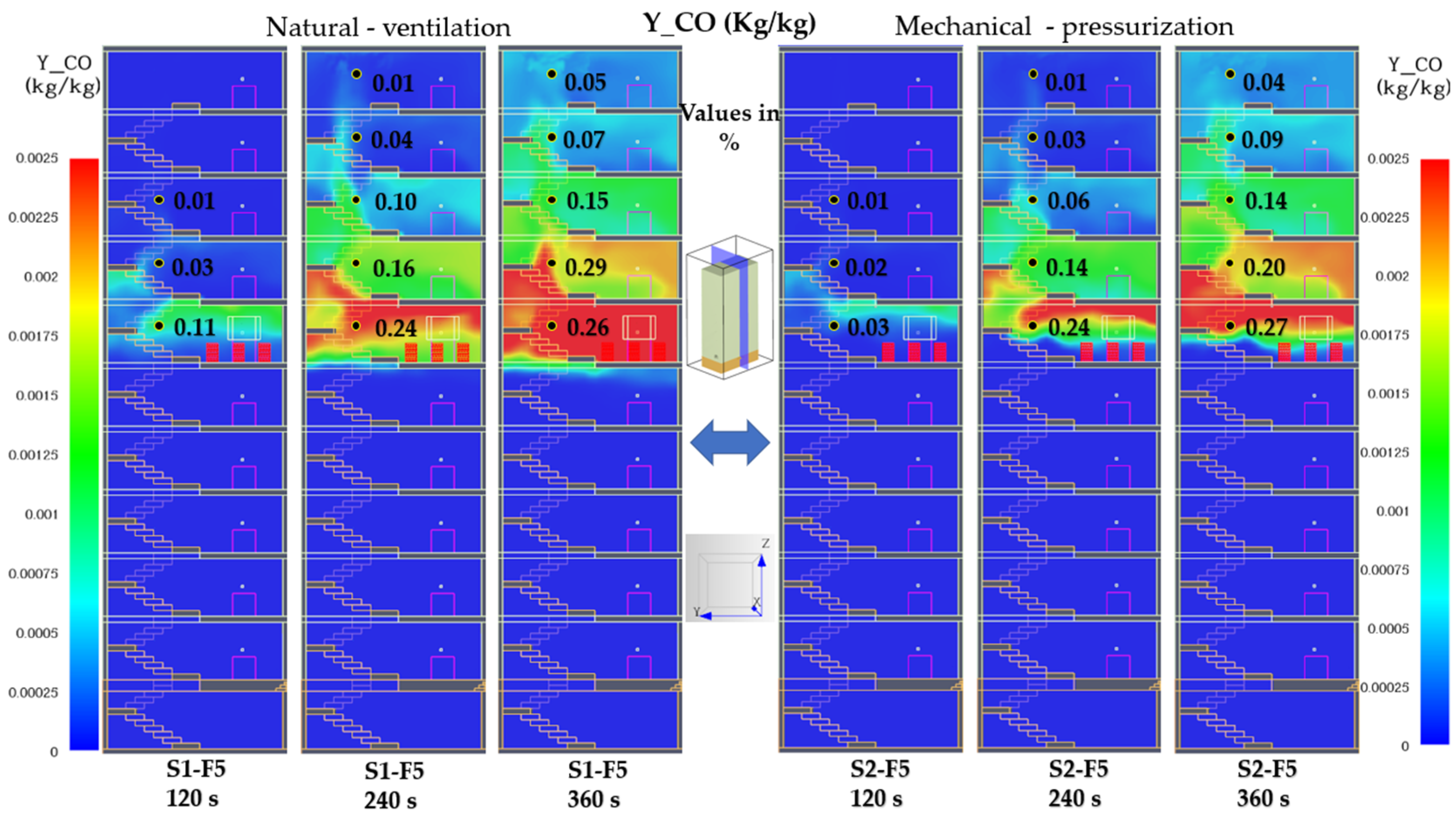 Figure 23), carbon monoxide concentrations exceed the critical threshold of 0.12% (1200 ppm) near the fire source located on the fifth floor. Under natural ventilation (S1-F5), mean CO levels reach 0.164% (1.64 × 10