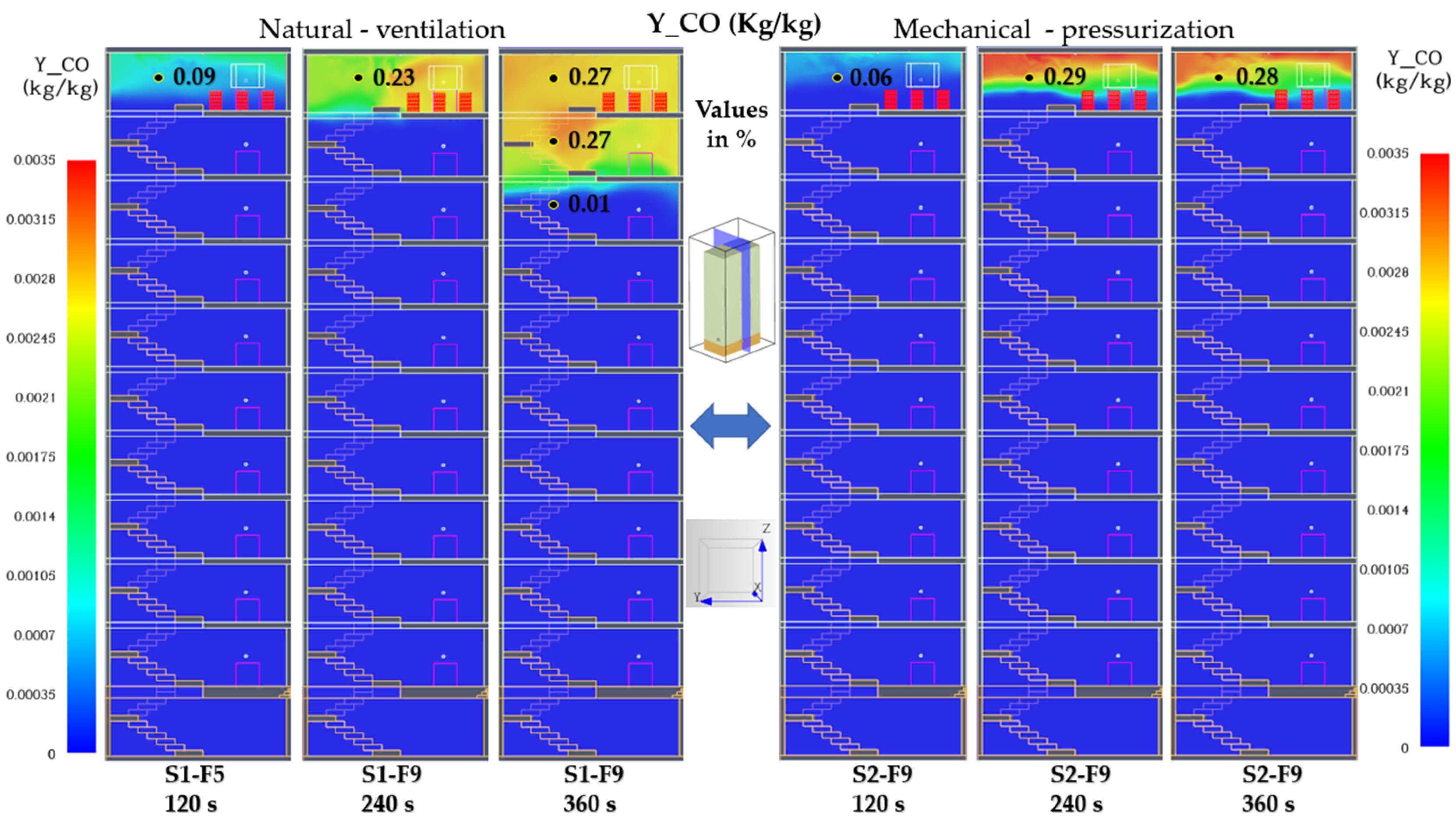 Figure 24), carbon monoxide concentrations in the upper part of the building exceed the tenability threshold of 0.12%, reaching 0.27% under natural ventilation and 0.28% under mechanical pressurization. In S1-F9, CO accumulates in a stable upper layer confined between floors 8 and 9, with negligible downward propagation due to strong thermal stratification. In S2-F9, positive pressure generated at the stairwell base prevents smoke intrusion into the lower floors but intensifies local accumulation near the fire compartment, where counter-flow buoyancy limits venting.