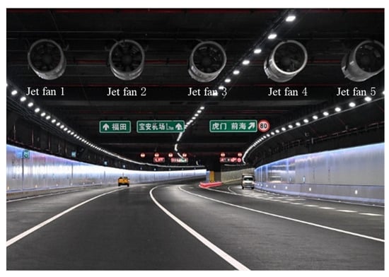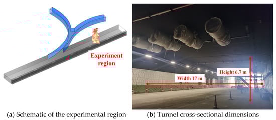 The full-scale fire experiments were conducted in the entrance section of the immersed undersea tunnel of the Shenzhen–Zhongshan Link. The cross-section of the experimental region is approximately 17 m in width and 6.7 m in height, as shown in Figure 4. To establish a stable fire source, and following the approaches adopted in previous studies [19,20], methanol-fueled pool fires were used in the full-scale tests. The heat release rate was adjusted by varying the burning surface area of the fuel pool.