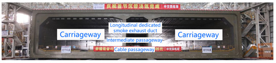 The Shenzhen–Zhongshan Link is located in the central region of the Pearl River estuary in Guangdong Province, China. It starts from Shenzhen Airport in the east and terminates at Hengmen on Ma’an Island in Zhongshan, with a total length of approximately 23,978 m. It is the most convenient cross-sea corridor in the Guangdong–Hong Kong–Macao Greater Bay Area. The project is an ultra-large sea-crossing infrastructure complex comprising offshore bridges, artificial islands, an undersea tunnel, and an underwater interchange tunnel [1]. The undersea tunnel has a total length of 6845 m, including a 5035 m immersed-tube section. Its standard cross-section accommodates eight bidirectional lanes (46 m in width), making it the widest immersed-tube tunnel currently constructed worldwide (as shown in Figure 1). The main tunnel adopts two bores and one central gallery configuration (as shown in Figure 2), with the central gallery subdivided into three compartments [1].