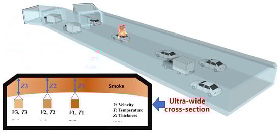As a representative ultra-wide undersea tunnel, the Shenzhen–Zhongshan Link exhibits fire smoke spread behaviors fundamentally different from those observed in traditional road tunnels. In ultra-wide cross-sections, the radial flow region of smoke becomes more pronounced. Coupled with the evolution of potential fire source parameters within the tunnel, this leads to substantial lateral variations in key smoke dynamics parameters and results in a complex two-dimensional distribution and evolution of smoke flow characteristics in the main tunnel, as shown in Figure 3.