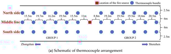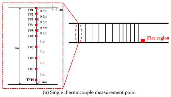 In addition, the temperature measurement system used in this study consisted of thermocouples connected to a data acquisition module, covering a total length of approximately 200 m, with the fire positioned at the midpoint of the system. On each side of the fire, 30 temperature measurement cables were installed, arranged in three longitudinal rows: one along the tunnel centerline and two along the tunnel sidewalls. Each row contained six cables, resulting in a total of 36 temperature measurement cables symmetrically deployed on both sides of the fire. The spacing and layout arrangement are shown in Figure 6a. Each temperature measurement cable was fixed beneath the tunnel ceiling using magnetic mounts or cable ties. A single cable was 7.0 m in length and was equipped with ten temperature measurement points. The vertical spacing of the measurement points along each cable was 0.1 m, 0.5 m, 0.5 m, 0.5 m, 0.5 m, 0.5 m, 1.0 m, 1.0 m, 1.0 m, and 1.0 m from top to bottom. The detailed configuration is shown in Figure 6b, ensuring that the collected data captured the vertical temperature distribution throughout the tunnel cross-section.
