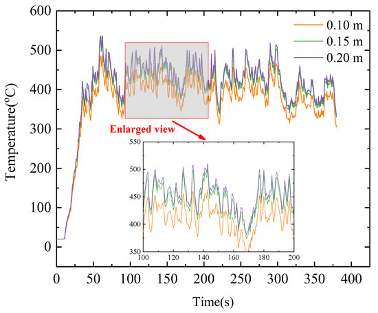In this study, the maximum heat release rate does not exceed 50 MW. Based on Equation (2), the corresponding characteristic diameter D* is no greater than 1.84. The dimensionless expression D*/δx serves as the basis for determining the FDS mesh size. Previous studies have recommended maintaining the dimensionless ratio D*/δx within the range of 5 to 10 [26,27]. Accordingly, for a heat release rate of 50 MW, the recommended mesh size δx for the numerical simulations in this study falls within 0.184 m to 0.368 m. To further assess grid sensitivity and determine an appropriate mesh resolution, mesh sizes of 0.10 m, 0.15 m, and 0.20 m were selected for comparative simulations. The temperature results obtained under a 50 MW fire condition using different mesh resolutions are shown in Figure 8.