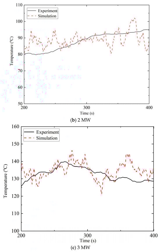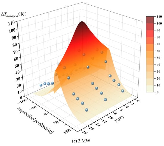 Based on the above prediction framework, the temperature rise of hot smoke at any longitudinal and lateral position within an ultra-wide tunnel under natural ventilation can be determined. To validate the proposed two-dimensional longitudinal prediction model for hot smoke temperature rise, experimental data obtained from actual full-scale fire scenarios were used for verification. In this study, three sets of full-scale fire experiment data from the ultra-wide tunnel, corresponding to fire heat release rates of 1 MW, 2 MW, and 3 MW, which were selected for comparison, as shown in Figure 16.