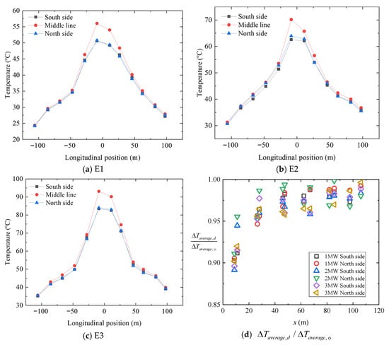 In this study, the average temperature rise values during the steady burning stage were used for analysis. As described earlier, three groups of thermocouples were installed at each cross-section in the full-scale fire experiments of the Shenzhen–Zhongshan immersed tunnel, corresponding to the south side, north side, and centerline measurement points. This section extracts the average temperature rise data recorded at all measurement points in tests E1, E2, and E3 during the longitudinal propagation of hot smoke in the ultra-wide tunnel. These data are arranged according to their corresponding spatial coordinates and presented in Figure 10a–c. Furthermore, the lateral temperature rise ratio at the same longitudinal position is introduced and arranged as a function of the longitudinal distance from the fire, as shown in Figure 10d.