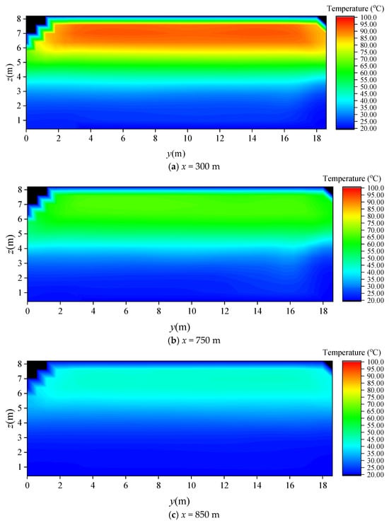 To further investigate the lateral temperature rise characteristics at greater distances under the influence of an extremely high heat release rate, numerical scenario S7 (HRR = 50 MW) was selected for analysis. Temperature slices at steady state were extracted at locations far from the fire source (x = 300 m, 750 m, and 850 m), as shown in Figure 11. Despite the very high fire intensity (HRR = 50 MW) and the substantial distance from the fire, noticeable lateral variations in temperature rise remain present within the ultra-wide tunnel cross-section. However, these lateral differences gradually diminish as the hot smoke propagates longitudinally, which is consistent with the average temperature rise characteristics observed in the full-scale experiments.