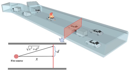 In this expression, α denotes the heat loss coefficient during the propagation of hot smoke, Wp is the boundary length along which the hot smoke layer exchanges heat with the ambient environment, and Cp represents the specific heat capacity of the hot smoke at constant pressure. denotes the mass flow rate associated with the one-dimensional spread of smoke, which can be regarded as approximately constant [17,31]. Considering that, in both the experiments and simulations, neither continuous nor intermittent flames in the fire plume reached the tunnel ceiling, the reference point in Equation (4) can be taken at the fire location, that is, xo = 0 m. From a longitudinal perspective, the temperature rise of hot smoke at any position x along the tunnel and any lateral location d within an ultra-wide cross-section can be simplified as the result of a one-dimensional ceiling jet motion from the fire to that point, as illustrated in Figure 12 below.