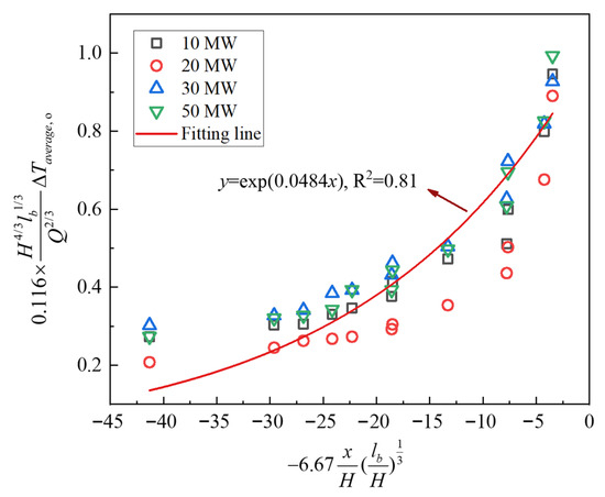 Despite the use of different heat release rates and longitudinal cross-sections, the data points calculated from Equation (6) exhibit a clear convergence trend, demonstrating the validity of the formulation proposed in this study. In addition, the data points follow a convergent exponential pattern. Based on this observation, the numerical data were fitted using an exponential function of the form y = ex (R2 = 0.85). The resulting fitted relationship is expressed in Equation (7).