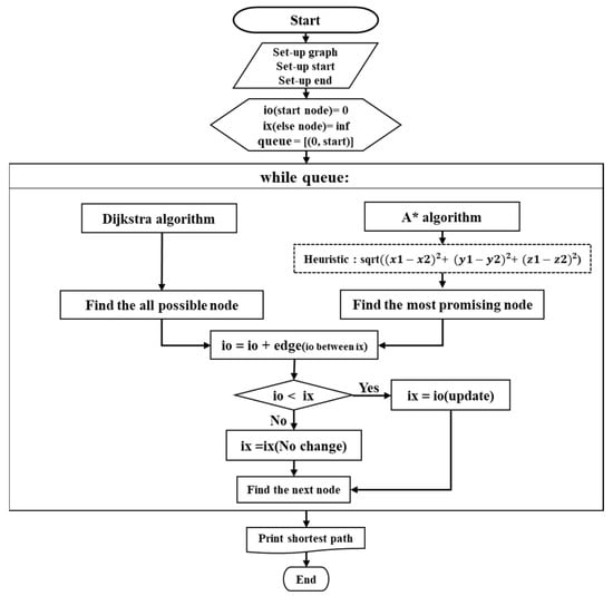 To evaluate algorithmic performance under static and dynamic conditions, this study applied two representative pathfinding algorithms, Dijkstra’s algorithm and the A* algorithm, which are widely recognized as optimal route search methods. Pathfinding algorithms are generally classified into two categories: uninformed (blind search) and informed (heuristic-based) search methods.