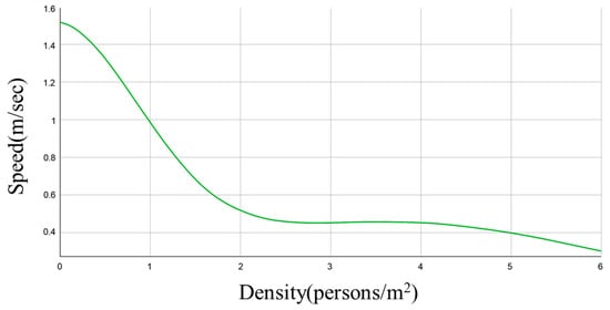 Based on these minimum capacity thresholds, a speed reduction table was constructed using the relationship between occupant density (person/m2) and walking speed presented by Zhou et al. [36], as shown in Figure 4. According to this relationship, when the occupant density is 1 person/m2, the walking speed is approximately 1 m/s. As the density doubles to 2 persons/m2, the walking speed decreases to 0.5 m/s, and when it triples to 3 persons/m2, it decreases to approximately 0.4 m/s. Beyond this level, the walking speed falls below 0.3 m/s.