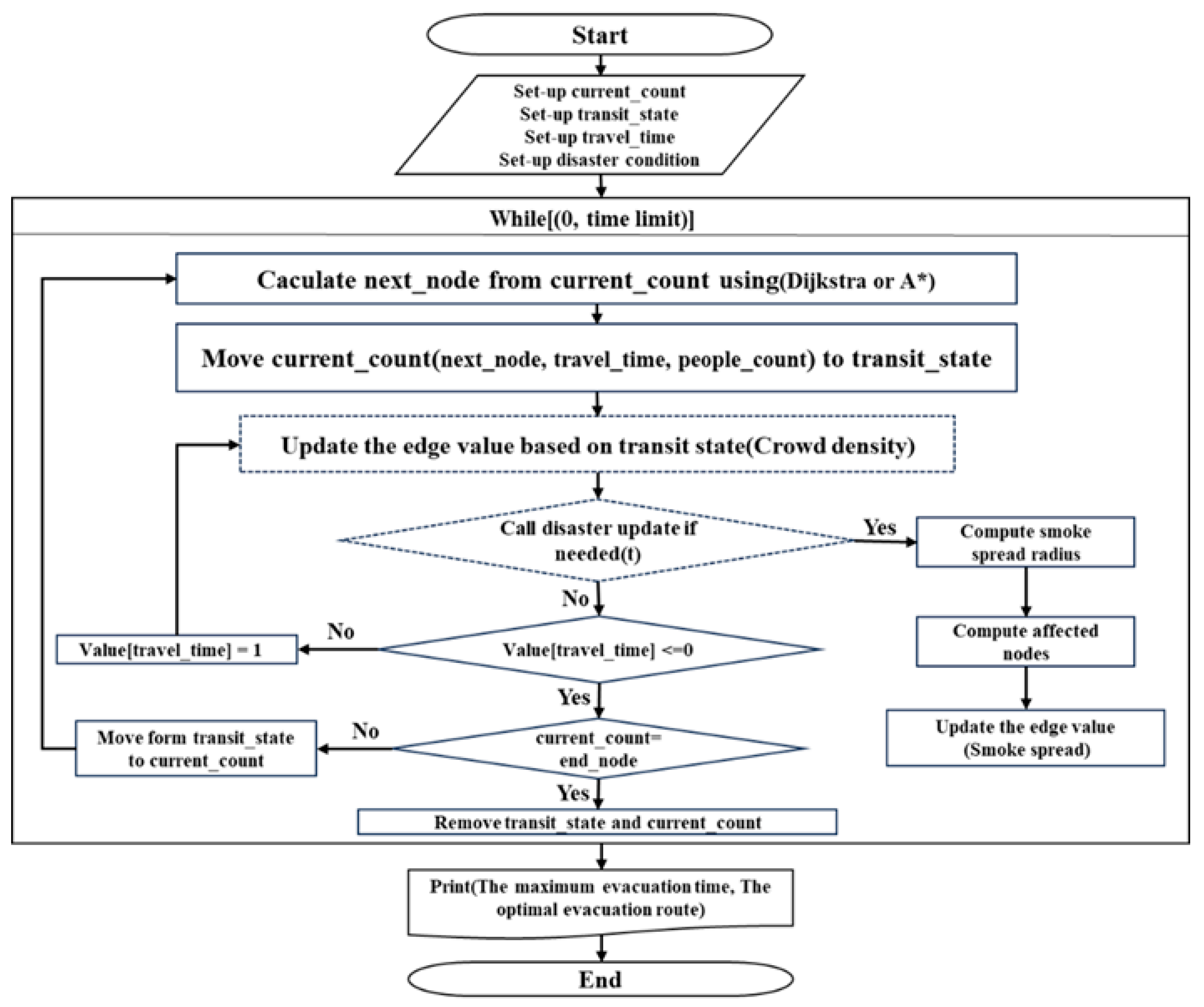 The computational procedure of the evacuation simulation model is as follows. Prior to executing the code, the number and locations of evacuees (current_count), movement information (transit_state), travel time (travel_time), and disaster conditions are initialized. Once the simulation begins, optimal evacuation routes are identified using route-finding algorithms, namely Dijkstra and A*. Evacuees stored in current_count are then transferred to transit_state, together with the corresponding travel time values representing the next movement segment. The transit_state records the origin node, destination node, number of evacuees, and remaining travel time.