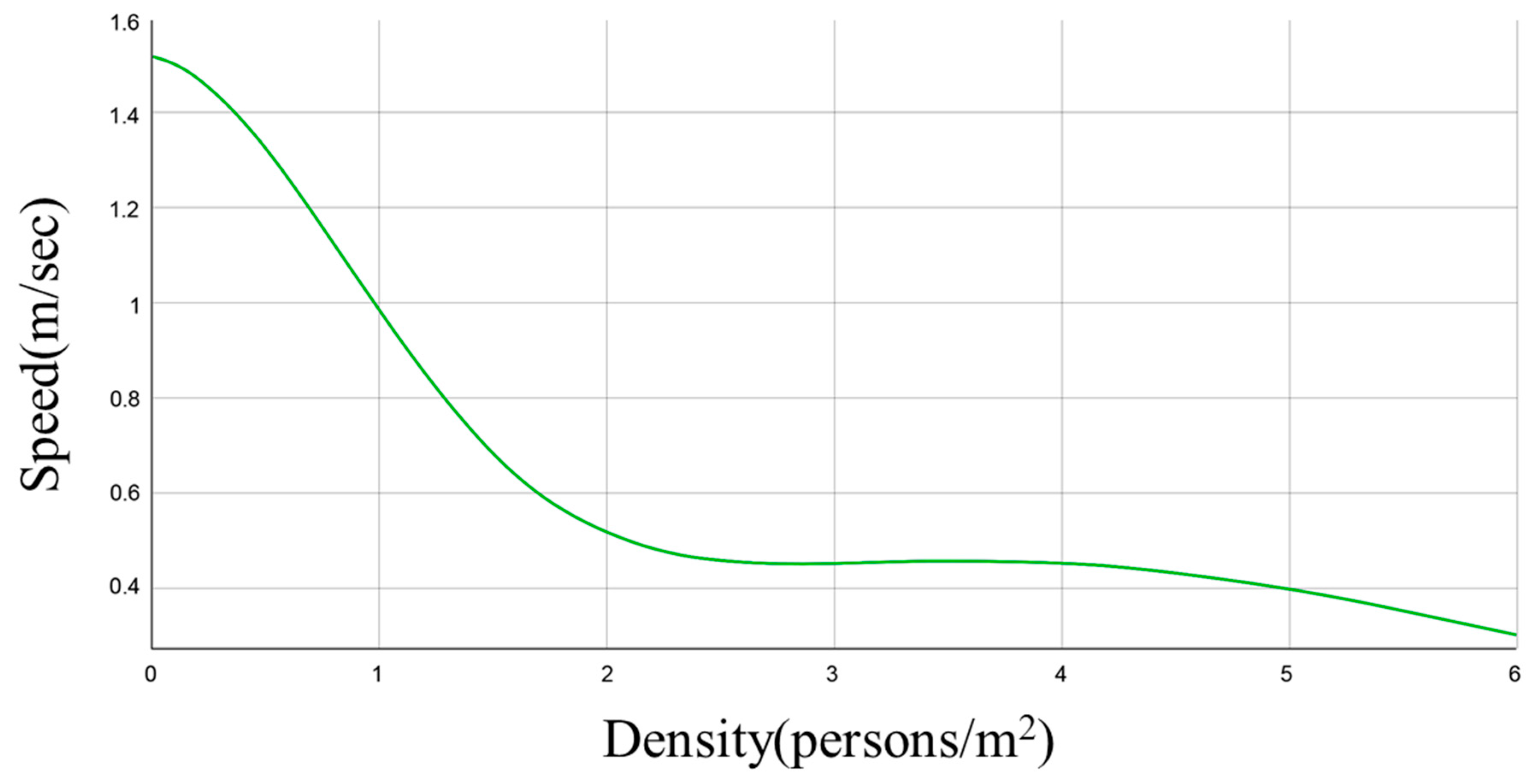 2, the walking speed decreases to 0.5 m/s, and when it triples to 3 persons/m