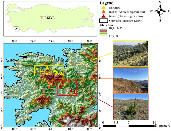 In recent years, however, wildfires in southwestern Türkiye, especially along the coastal belt, have deviated from the natural regime and become anthropogenic environmental crises. Türkiye is among the rare regions of the world that host three of the 36 recognized global biodiversity “hotspots” [5,6,7]. Within the Mediterranean phytogeographic region, the southwestern Anatolian Muğla area is particularly known as a fire-prone landscape, where human-induced forest fires in recent years have further threatened the fragility of ecosystems. Over the last five years, intentional ignitions, waste burning, negligence from power transmission lines, and the increasing influence of climate change have led to the occurrence of megafires—large, high-intensity wildfires. These fires not only cause extensive physical damage but also disrupt community composition, ecosystem processes, and the natural regeneration capacity of forests. In the Muğla region, vast areas have been affected by wildfires since 2021. In 2021, the Marmaris İçmeler fire affected 12,289 ha, the Köyceğiz fire 10,890 ha, and the Milas fire 17,767 ha [8]. In 2022, the Marmaris Bördübet fire classified as a megafire affected 4392 ha [9]. Following these events, the Turkish General Directorate of Forestry has implemented different post-fire silvicultural practices [9,10]. These practices include artificial regeneration (afforestation/active restoration), natural regeneration (line sowing, seed dispersal, spreading cone-bearing branches/passive restoration), and unmanaged areas left for natural recovery [11,12,13].