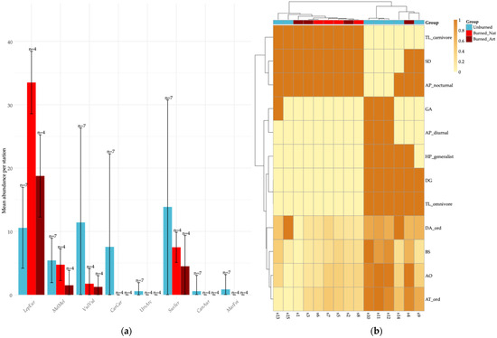 Mammalian community responses to fire in terms of species abundance and functional trait composition: (a) Mean abundance of mammal species across stations, with error bars representing standard deviation (SD) and labels indicating sample size (n) per treatment. Burned sites are presented as two distinct post-fire management categories—naturally regenerated (Burned_Nat) and artificially regenerated (Burned_Art)—while Unburned sites represent undisturbed reference habitats. Consistent with these contrasts, Lepus europaeus shows higher abundance in burned areas, whereas Caracal caracal occurs more frequently in unburned sites; (b) Heatmap of community-weighted means (CWM) of functional traits (scaled 0–1) at the station level, with hierarchical clustering illustrating among-station differences in functional composition. The colored annotation bar indicates treatment identity and clarifies the grouping of stations, whereas the internal color scale reflects CWM values only and does not correspond to treatment colors.