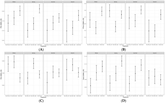 Linear mixed-effects models were used to test both the overall differences between burned and unburned areas, the variation among seasons, and the interaction between these two factors. Estimated marginal means (EMMs) were calculated using the emmeans package, and Tukey-adjusted multiple comparisons were performed to assess burned–unburned differences within each season and seasonal differences within each treatment. Results were presented graphically as EMM ± SE based on the season × treatment interaction [45].