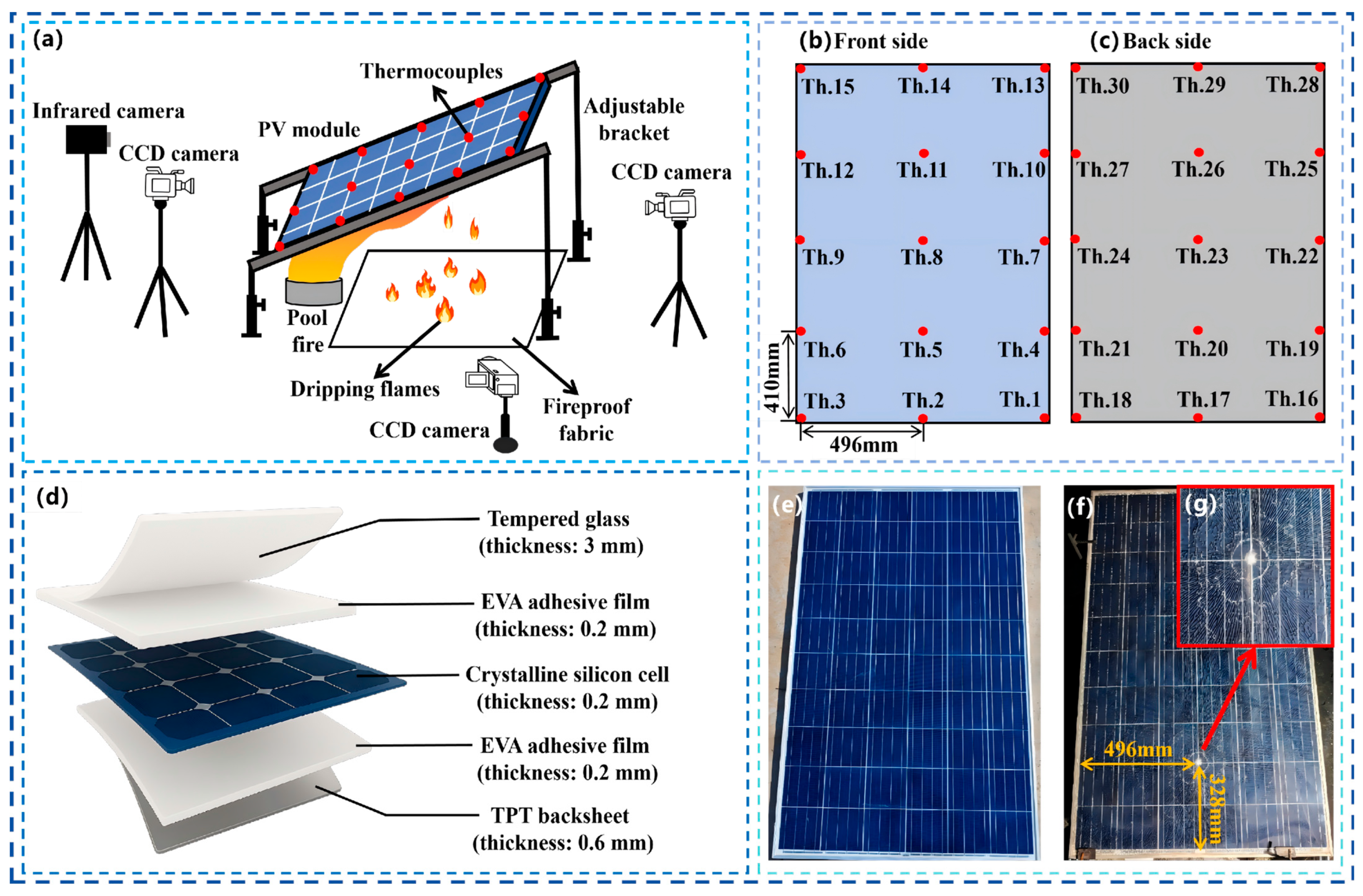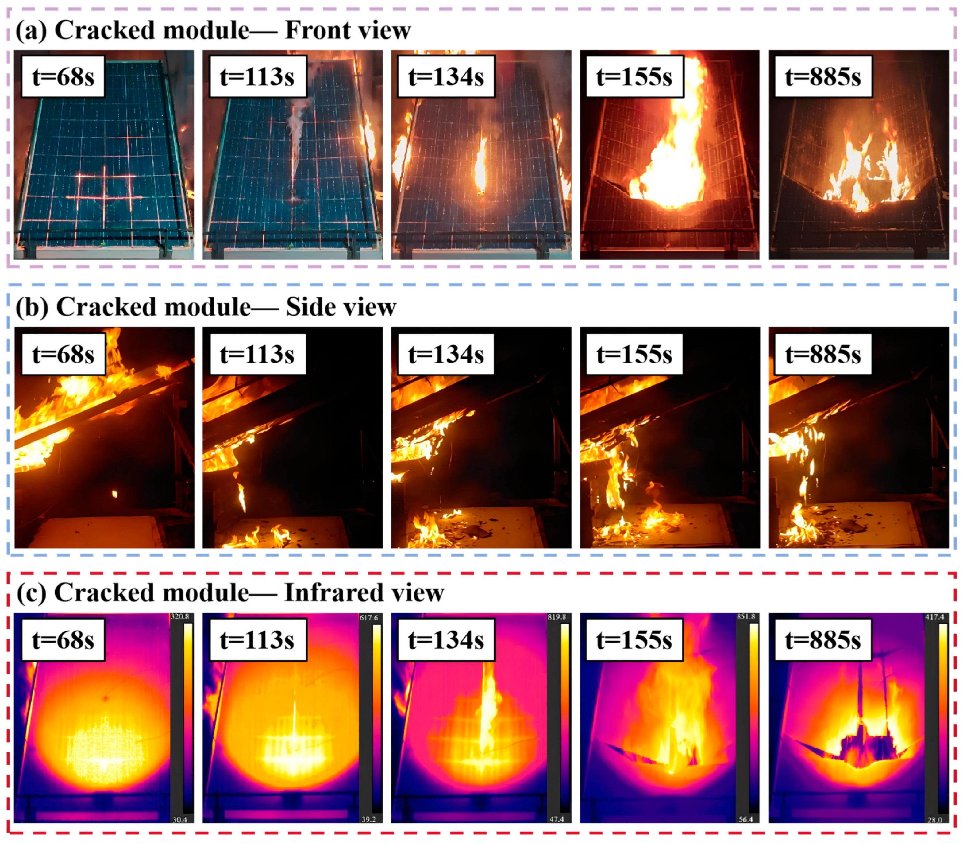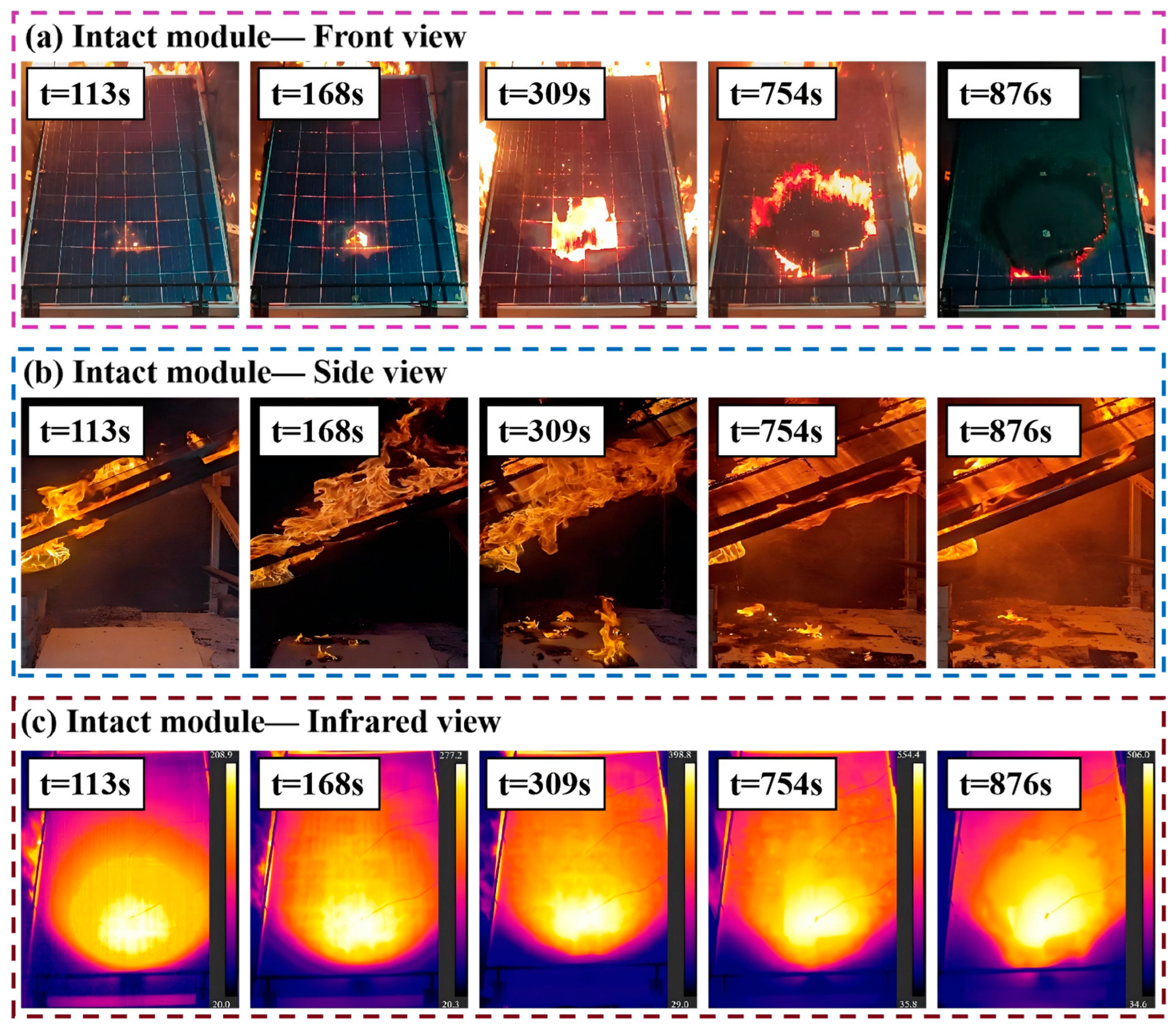 Figure 2a, the height of the pool fire increased rapidly, with its flame spreading along the backsheet of the PV module after ignition. Under the radiative heating of the fire plume, a grayish blistering region appeared on the module surface directly above the pool fire. As the pool fire continued to burn, this grayish region progressively expanded, and the crystalline silicon cells located above the fire began to crack and spall off. Meanwhile, the side view in
