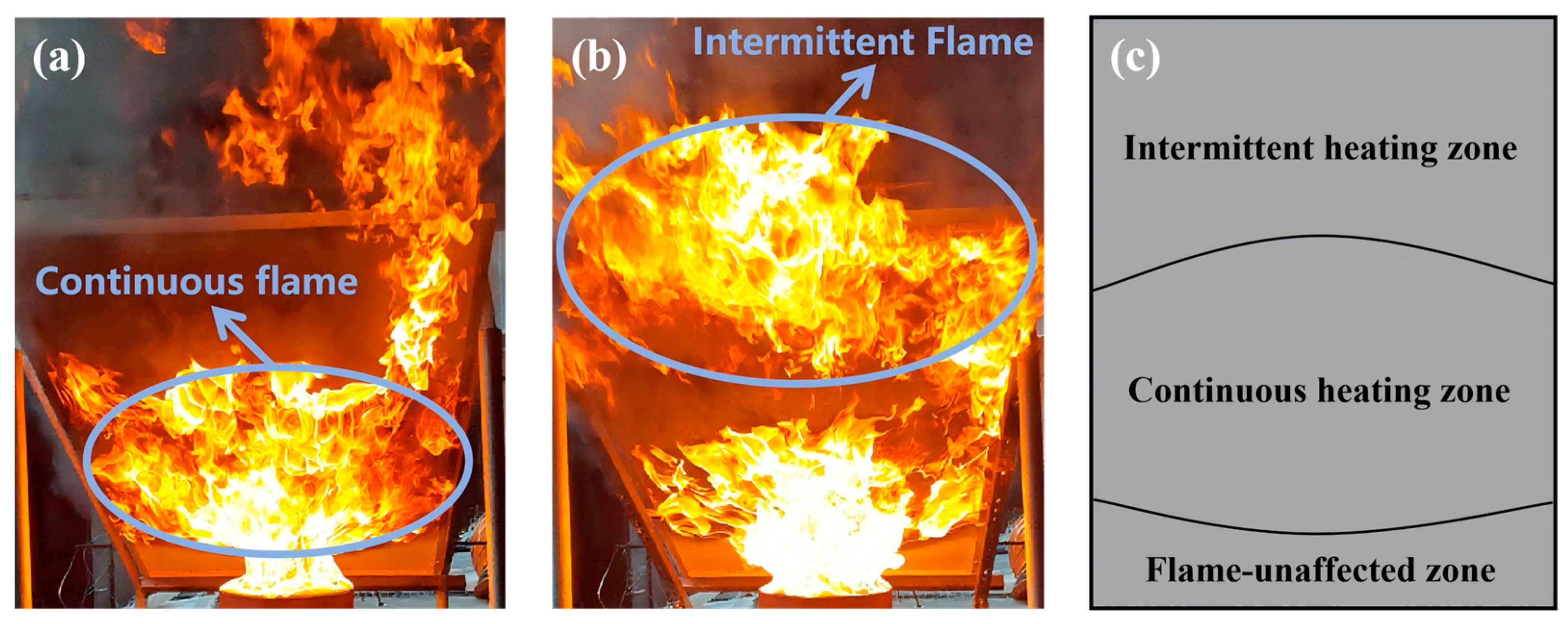 Figure 2, there existed distinct differences in the temperature-rise characteristics and burning behaviors across the three zones of the PV module. The temperature of the flame-unaffected zone was significantly lower than that of the other zones, and no ignition of the TPT film backsheet was observed in this zone. The flame in the continuous heating zone remained stably attached to the PV module, exhibiting the highest temperature-rise rate and burning damage rate, thereby resulting in the most severe degradation of the module throughout the fire exposure period. The intermittent heating zone, affected by air entrainment, experienced intermittent contact between the pool fire plume and the TPT film backsheet, resulting in a lower temperature compared to that of the continuous heating zone. There was a direct correlation between the temperature characteristics, burning damage severity, and the flame contact conditions.