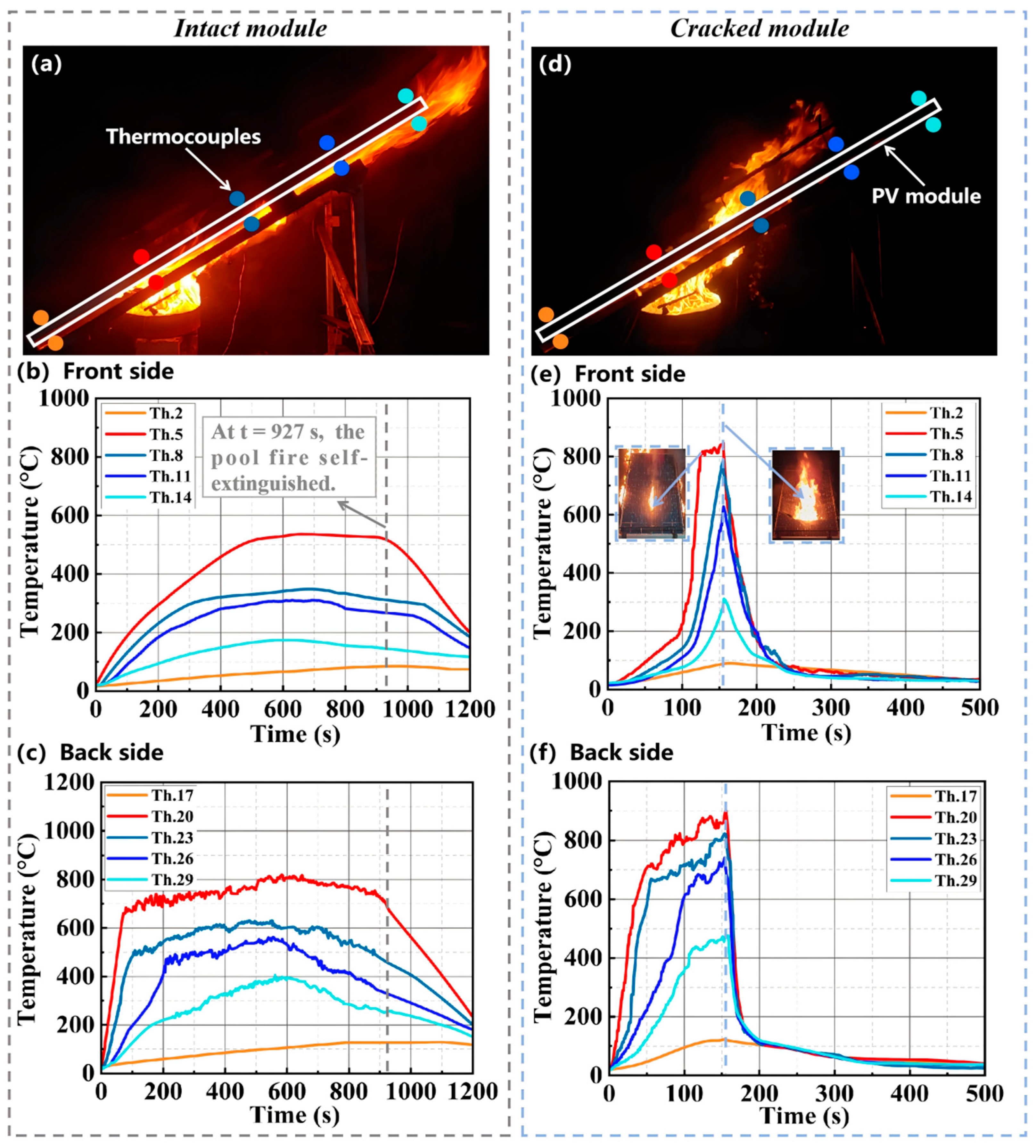 Figure 5e,f present the temperature histories along the centerline of the cracked PV module. Under pool fire exposure, the temperature of the cracked module rose sharply. At t = 134 s, the external fire source burned through the module, and the flame penetrated the vertical crack, causing the temperature at Th.5 to surge rapidly to 809.2 °C. By t = 155 s, large-scale fracture and spalling of the module occurred, and the temperatures at the front-side measurement points reached their respective maximum values. Subsequently, the external flames broke through the burn-through zones rather than continuously impinging on the backsheet, resulting in a steep decline in the module temperature. Meanwhile, the temperatures of the back side at various locations also plummeted abruptly after attaining their peak values, with a pronounced temperature gradient evident between thermocouples at the centerline.