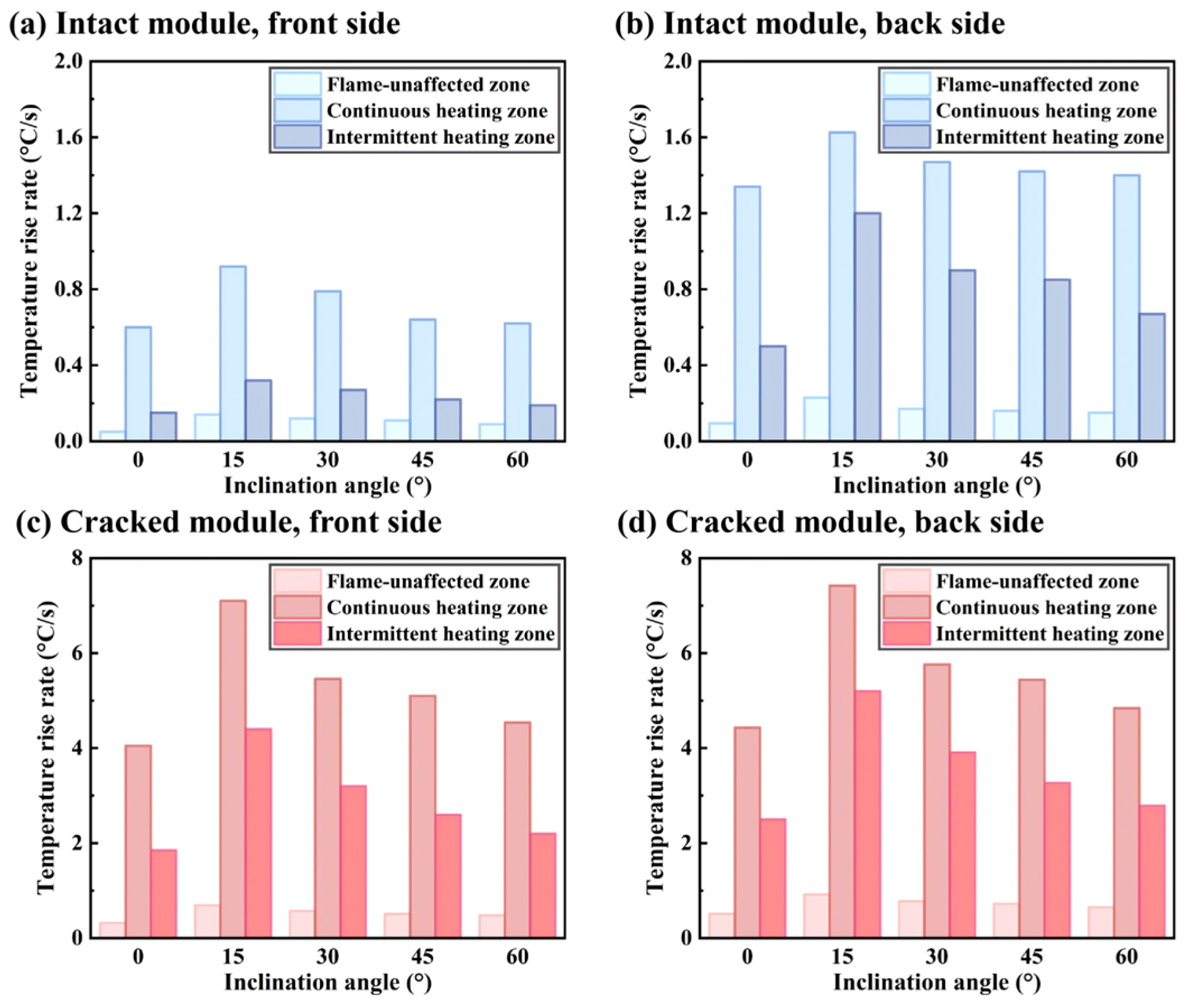 The above analysis demonstrated that single-glass PV modules exhibited pronounced spatial variations in temperature-rise rates across both front and back surfaces under varying glass integrity conditions. The continuous heating zone consistently showed the highest temperature-rise rate. In contrast, the flame-unaffected zone displayed the lowest rate, with this phenomenon underscoring that stable flame attachment and prolonged thermal exposure were the dominant contributors to the rapid temperature elevation. As the inclination angle increased from 0° to 60°, the average temperature-rise rates of all zones displayed a non-monotonic variation trend, first increasing and then decreasing.