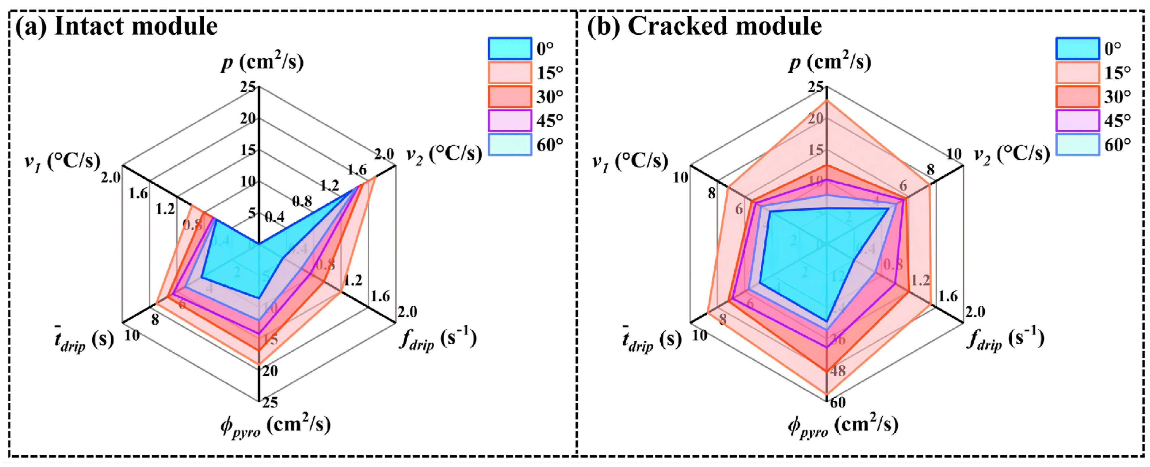 Figure 7 illustrates comparative radar plots of six fire characteristic parameters for intact and cracked PV modules across varying inclination angles. A comparison of the intact modules in