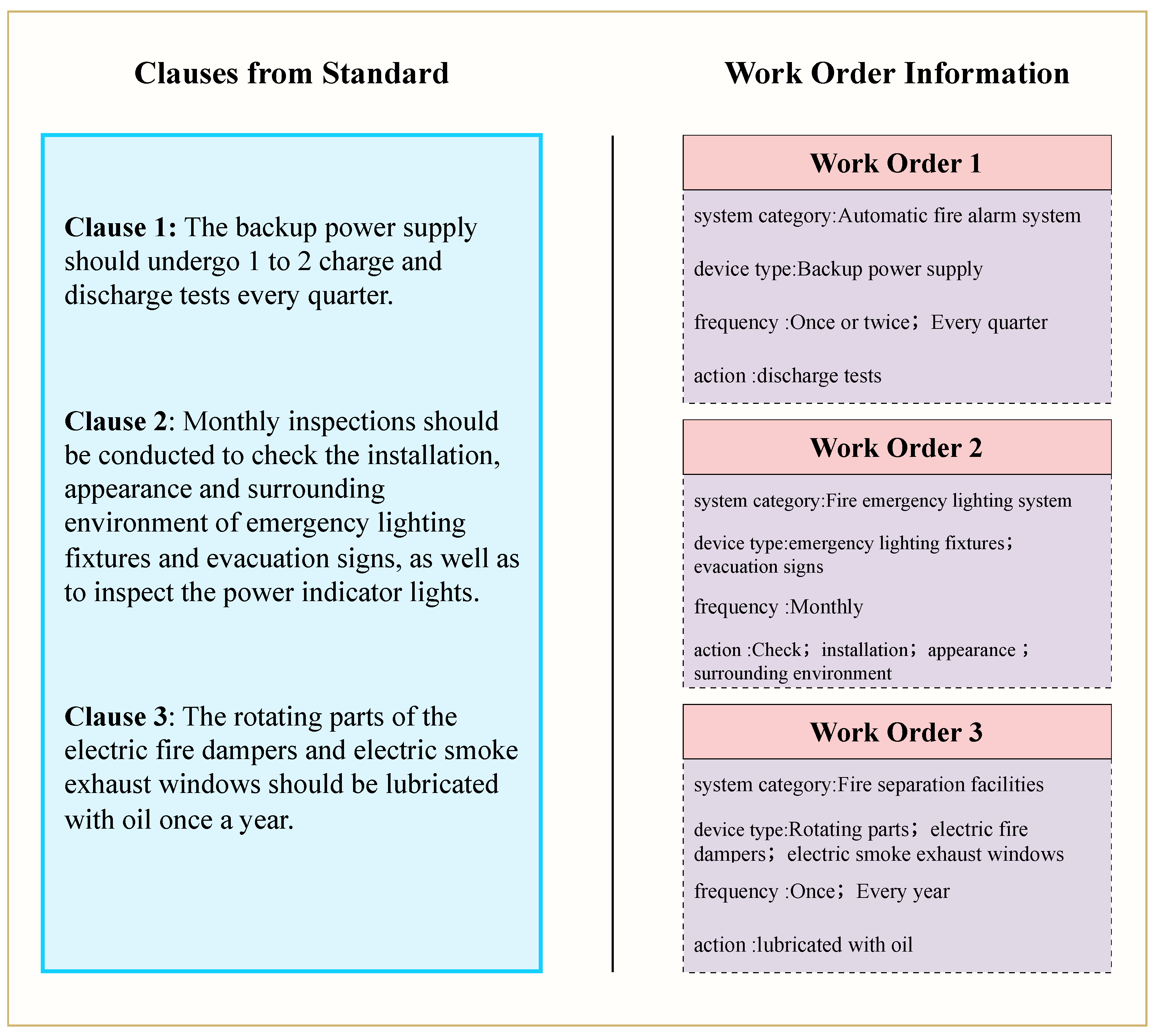 Standards documents frequently contain clauses where (i) a single clause covers multiple devices (or accessories)—for example, “functional testing shall be performed for smoke detectors, heat detectors, and manual alarm buttons”—or (ii) the same device is associated with different actions under different frequencies—such as “inspect monthly and clean annually.” Conventional generation approaches often collapse such content into a single work-order field, creating redundant, stacked information that weakens the work order’s actionability and specificity. To address this, we introduce a Decoupling constraint.