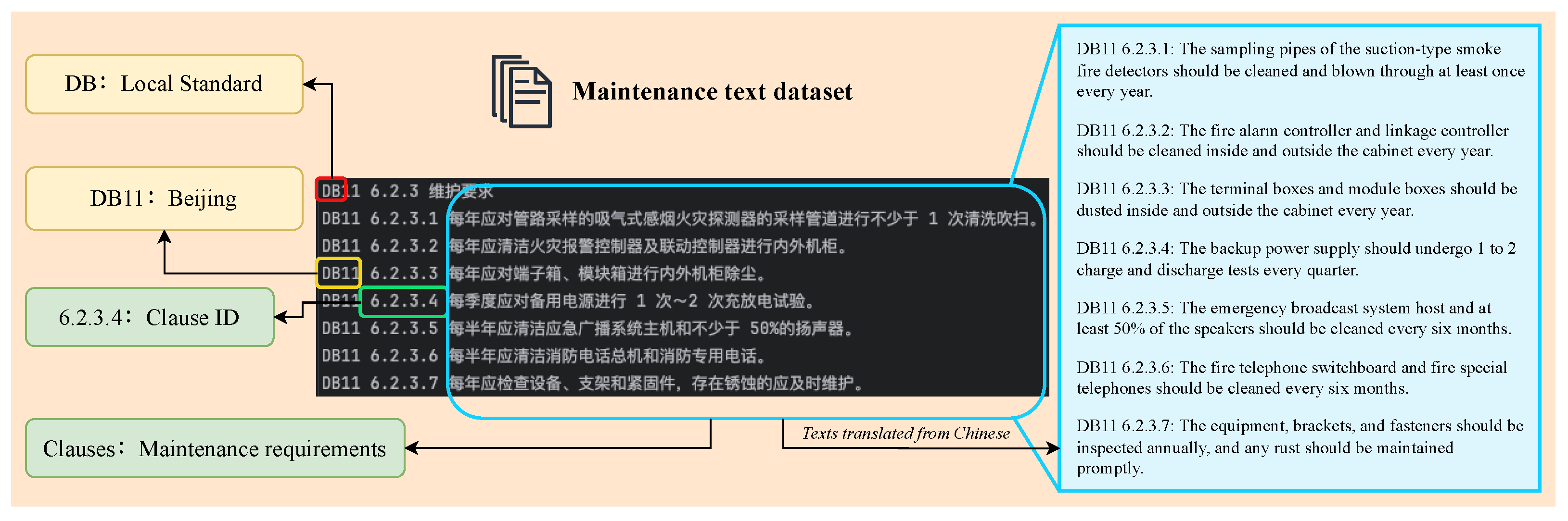 “DB” denotes a local (Provincial Standard) specification, while “DB11” indicates a Beijing local standard, meaning the clause applies to the Beijing region. “6.2.3.4” is the clause identifier, and the text highlighted by the blue box corresponds to the original maintenance clause. With this pre-processing design, the model can explicitly capture a clause’s applicable region during extraction, while also enabling evidence-based provenance tracing for each work-order requirement.