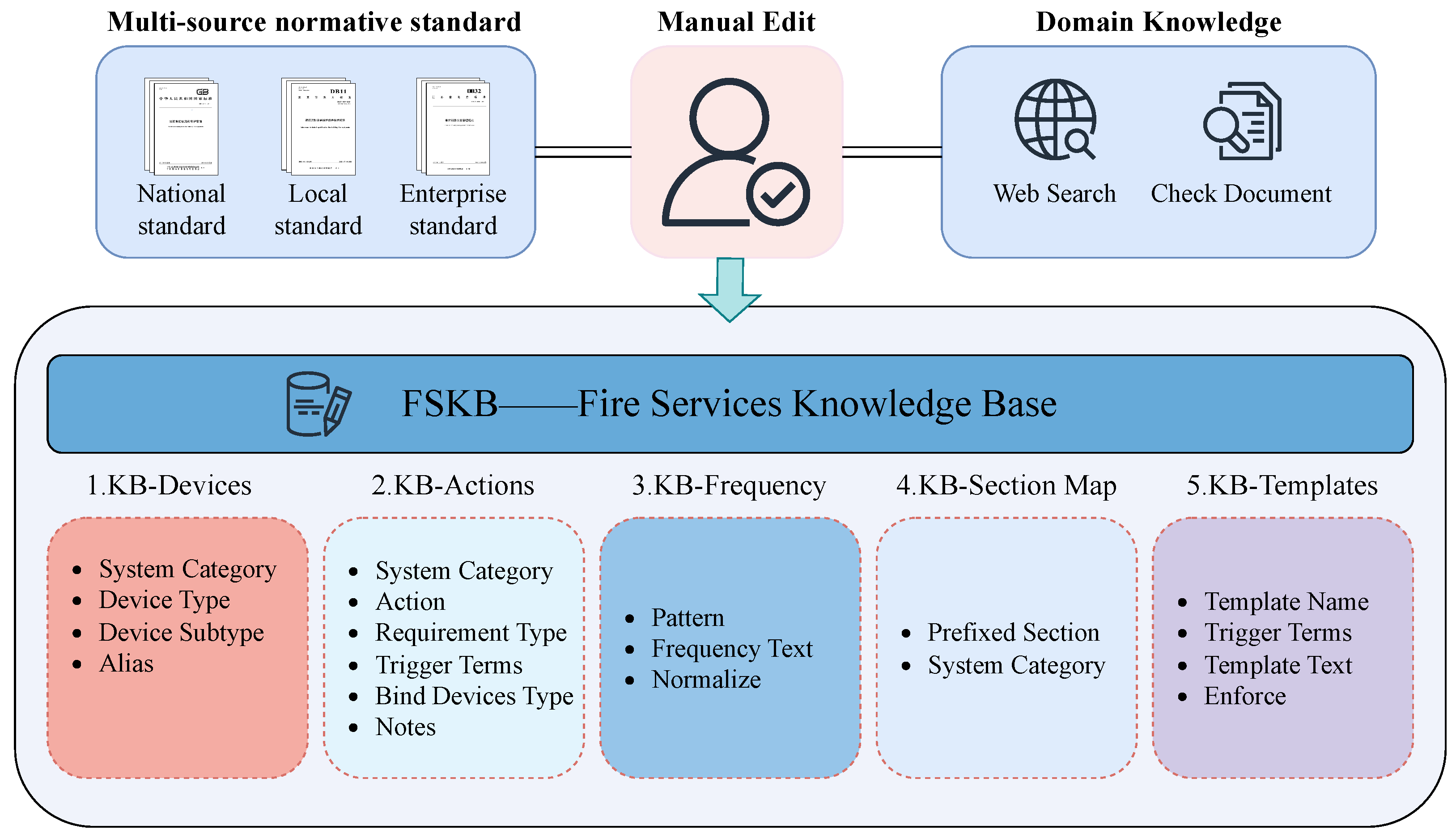 To mitigate “knowledge hallucination” and “terminology drift” that commonly occur when general-purpose LLMs are applied to specialized domains, we construct FSKB. FSKB is organized around key elements required for work-order generation—device types, subcomponents/accessories, maintenance actions, and maintenance frequencies—which are jointly used with regulatory clauses and interfaced with the generation model via the FS-RAG module. Unlike conventional unstructured document stores, FSKB is a curated collection of structurally organized strong-relevant knowledge cards. Through in-depth analysis of standards documents and domain knowledge in fire maintenance, we compile a domain-oriented “professional lexicon,” thereby ensuring both the accuracy and the strong logical consistency of the knowledge.