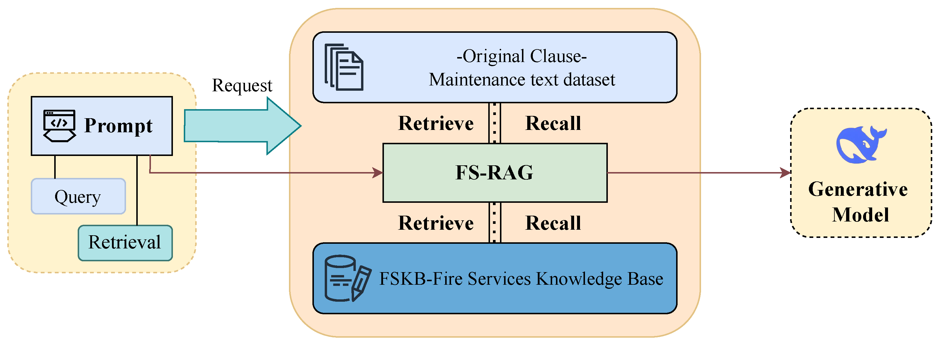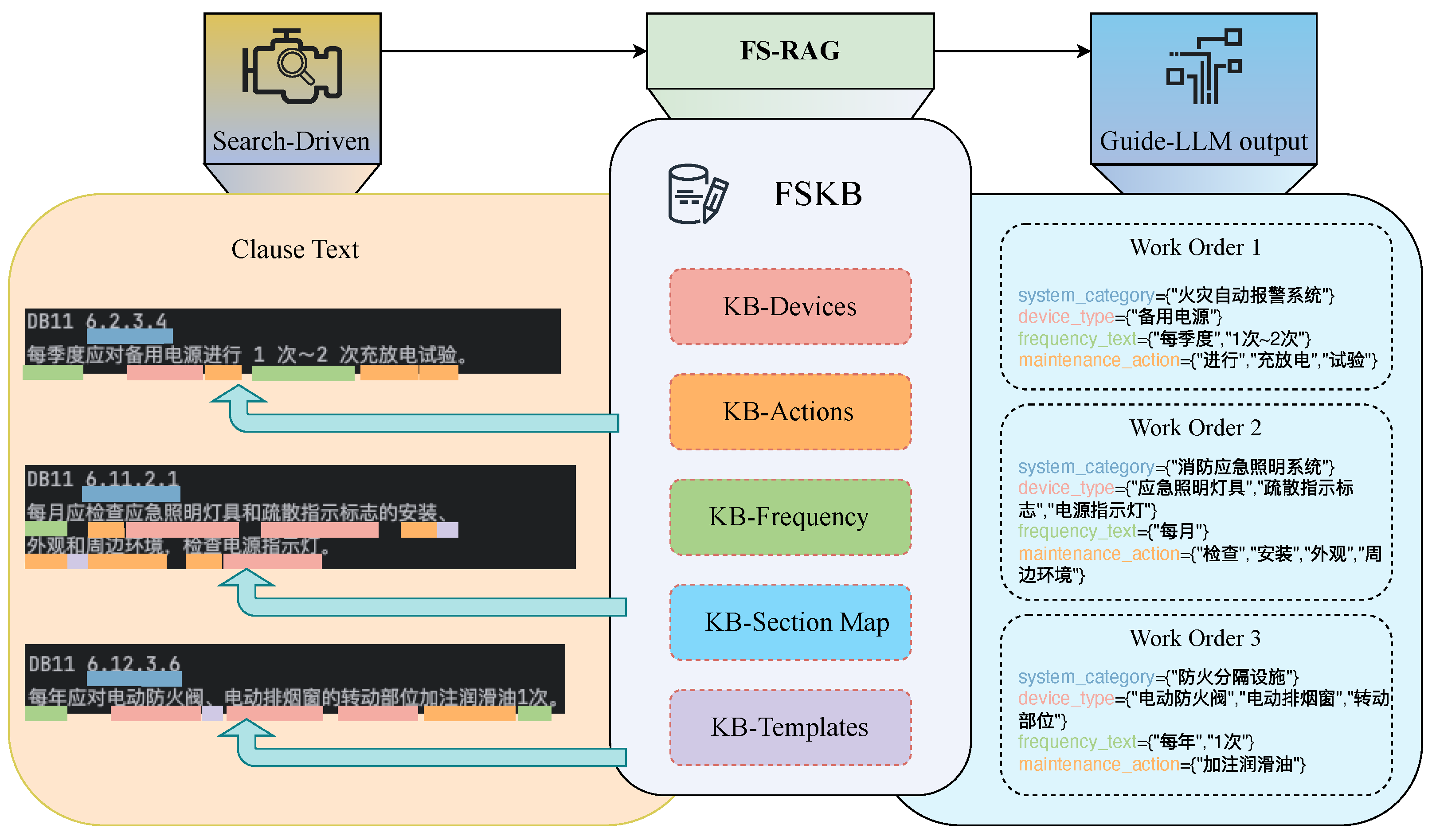 To mitigate hallucinations that arise when general-purpose LLMs are applied to fire maintenance tasks, as well as to reduce format drift under the strict constraints of work-order generation, we propose a retrieval-augmented generation framework—FS-RAG, which combines the FSKB. By using retrieval-augmented generation (RAG) [