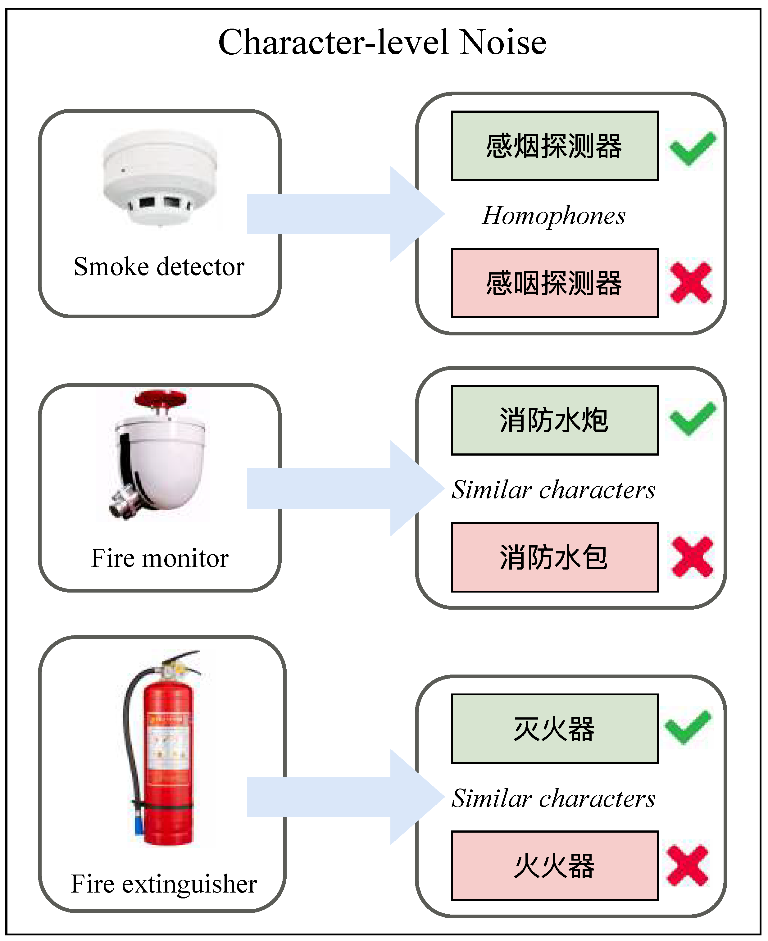 Character-level noise: Artificially simulating pinyin input-method errors, as shown in